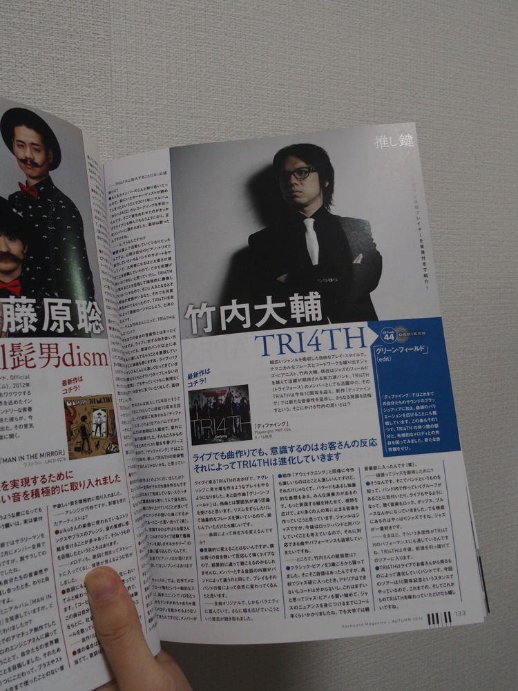 TRI4TH 加入の馴れ初め等も話していますので、どうぞ良かったら御覧になってみて下さい。調べてみると、キーボードマガジンの創刊は1979年6月の事で、年度的に言えば自分と同い年の雑誌である事も判明しました。当時の鍵盤楽器雑誌と言えばクラシックものが殆どだったようで、欧米ポピュラーミュージック文化や音楽理論に焦点をあてたキーボードマガジンは当時は相当画期的だったようです。その流れからの今回の雑誌掲載。本当に嬉しく思います。是非とも本屋でチェックしてみて下さいませ。よろしくお願いします!
