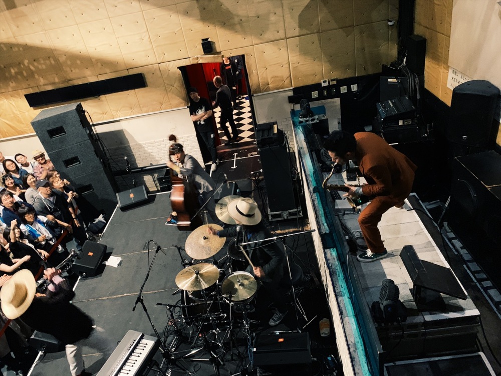 地下2階構成となっている月見ル君想フでは、バンドセットを囲むように客席を作るのも違和感はなく、そして場所によっては2バンドを上階から見下ろせるというのも面白いのかもしれません。正にパラシュートセッション向けのお店だとも思いましたが、円城さんがこの企画を始めて既に60回以上も実現しているのだそうで、お客さんにとっても、そして様々なバンド自身からの興味も凄く高いものだという事が窺えます。