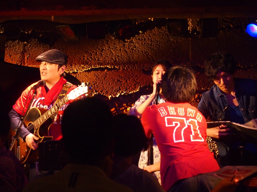 もう常に十分に盛り上がっていた空間になっていたので、アンコールを頂いたのは必至とも言えましょう。自分達はいったんステージ袖に戻り、次にステージに上がった時の丸本さんの姿と言えば、広島カープのユニフォーム&背番号15の黒田…。それだけで驚かされますが(笑)、そんな時にマイクをセッティングしてくれていたお店の方の服装が、赤いシャツ…、いや、これがまたカープの…(右上写真参照…笑)。何とも演者を盛り上げるのが上手いお店のスタッフですが(笑)、聞けば、普通に自宅からこの格好で来たそうで、深い本気度を感じたものでした。勿論、この時に演奏した曲は“Fifteen”で、又吉君は勿論、なんと樹海さんにも急遽参加をして頂きました(参加は樹海さん自身の希望で、本当に当日決まりました)。ここでの“Fifteen”もまた格別の時間だったかもしれません。実際に今シーズンのカープの調子も良過ぎる程ですし、今年は何かが起きるのかもしれませんね(笑)。