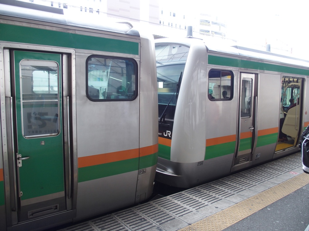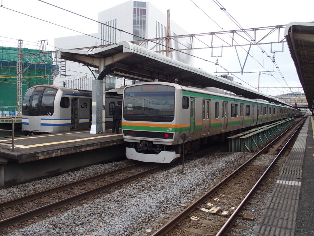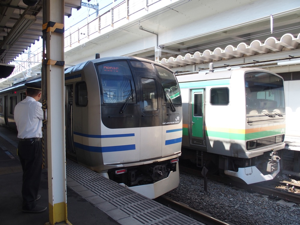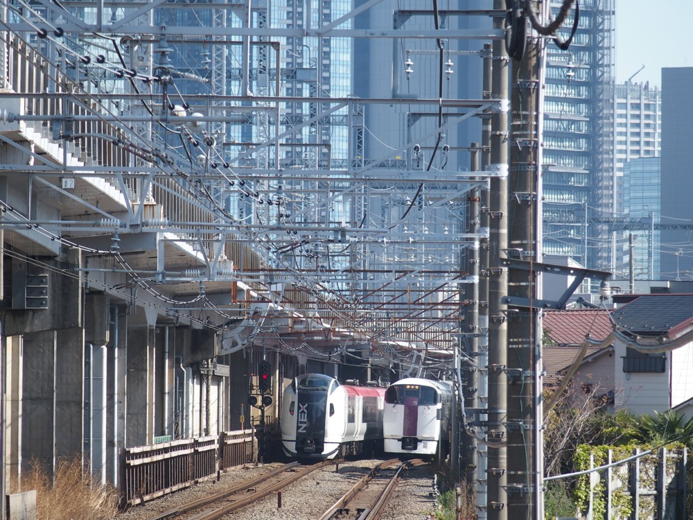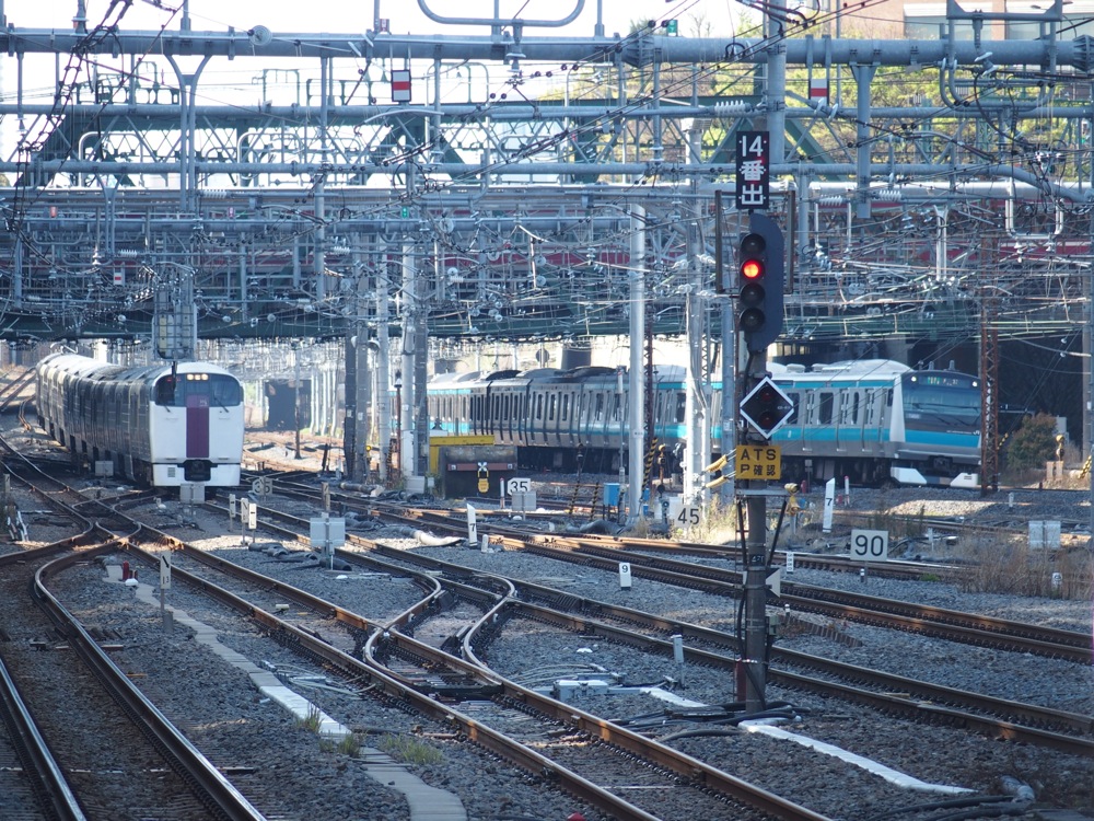 ここを通る列車は普通列車ばかりではなく、千葉県の銚子方面へと向かう特急『しおさい』号を始め、成田空港への足である特急『成田エクスプレス』は頻繁に発着しています。特急『成田エクスプレス』は、当駅で連結、切り離し(右上写真参照)を行い、ここから新宿方面と横浜方面へと乗客を振り分けています。