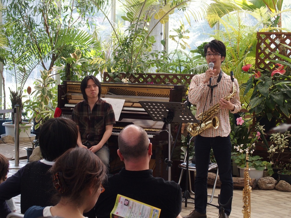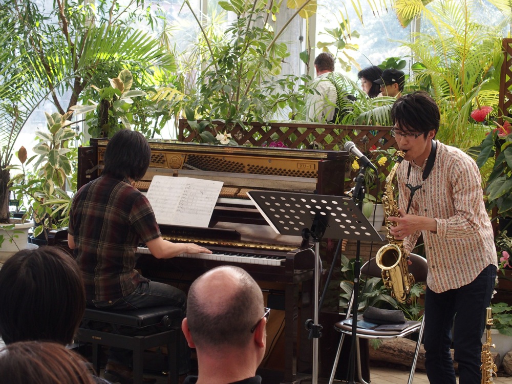 今回はテーマに“春”というのものを念頭に置きながら演奏していきました。ここは45分程のステージを1回のみなので、いつも5〜6曲という感じでセットリストを組んでいるのですが、パット・メセニーの“It's For You”を最初に爽やかに持ってきつつ、2曲目は早速、昨年リリースした『Fly Beyond』の中から“川の流れのように”をお送りします。そして、1曲ぐらいは自由度の高いジャズ・スタンダード曲を…という事で、“I'll Remember April”。春らしい…と言うか、全体的に春というキーワードをどこかで感じさせるような選曲…という趣向でしょうか。それでもそのキーワードにおける曲というのは、この熱帯植物館での環境に不思議と合いますし、曲もまた特徴的な印象を与えていると思いました。