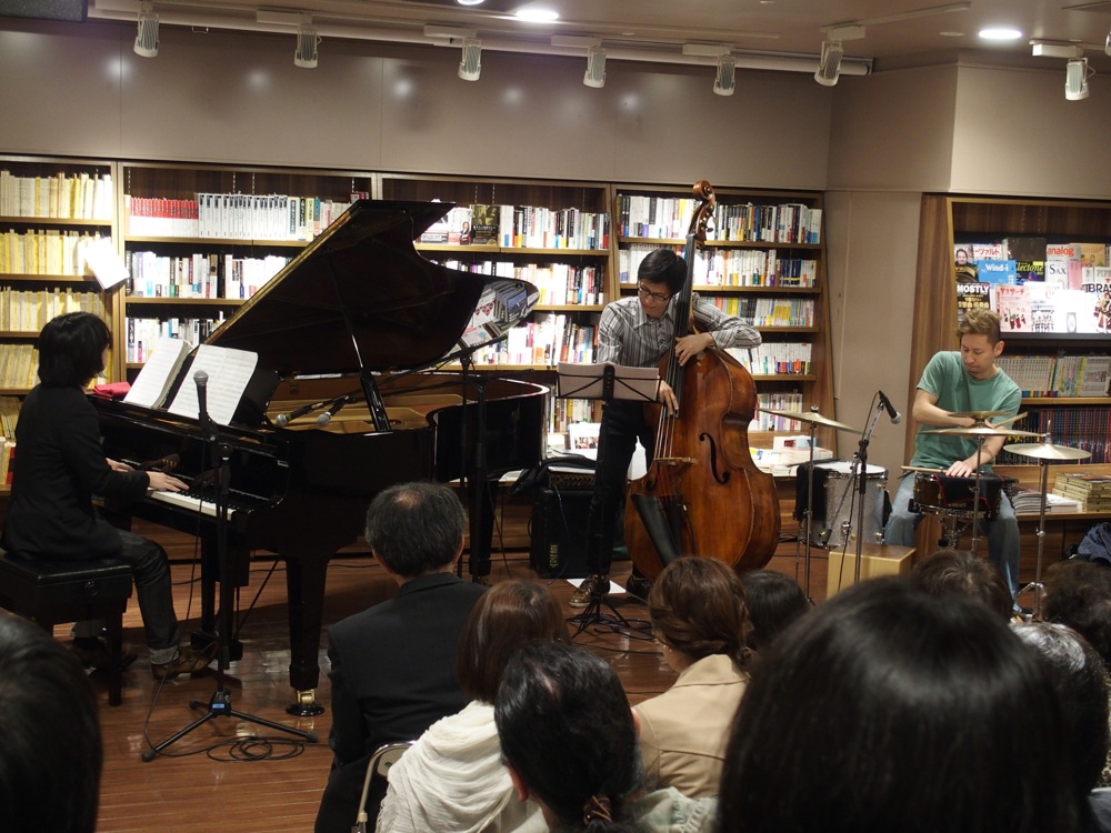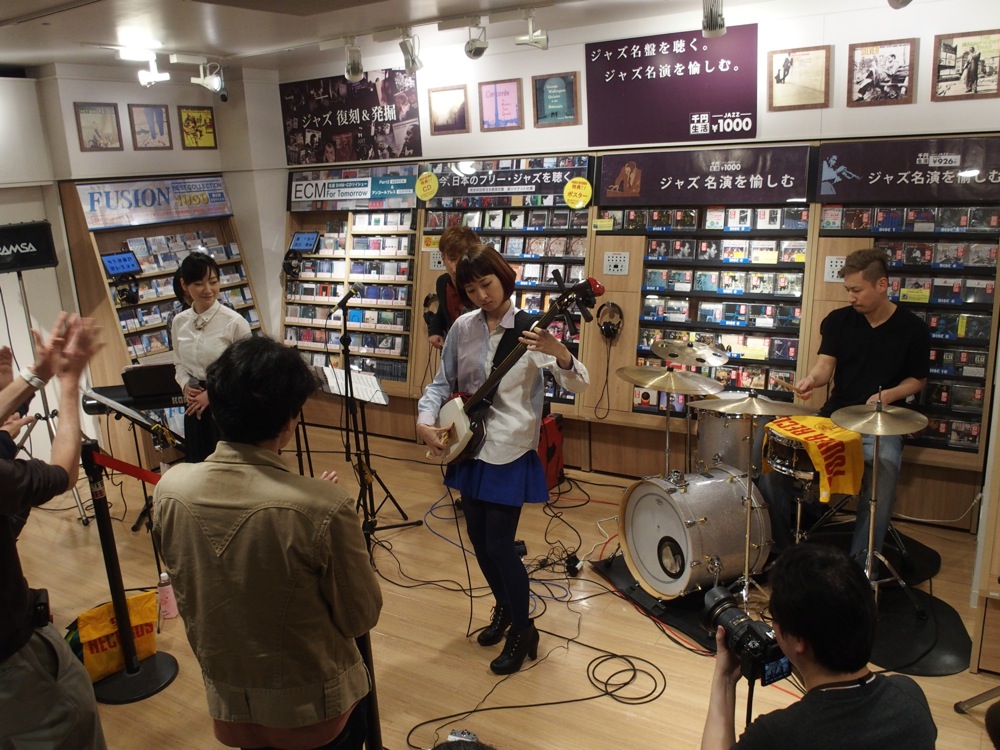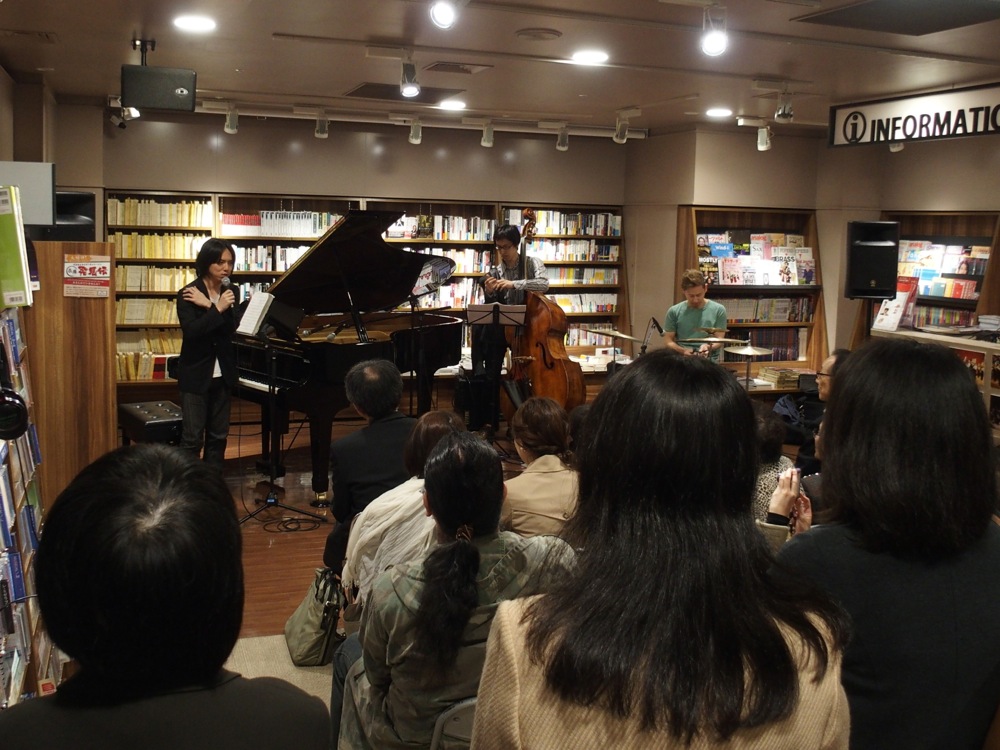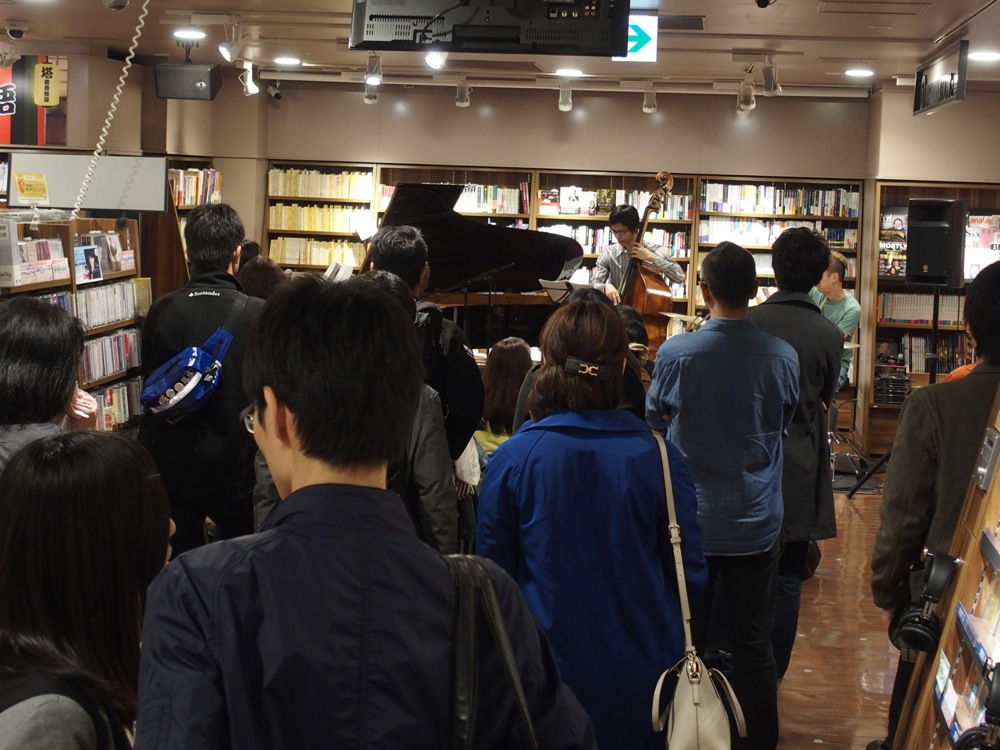 インストアライブのステージは約30分。…とは言え、この後に予定されているサイン会と合わせて約1時間…という見方をしているので、時間はたっぷりと取って、特に1曲1曲それぞれをコンパクトにしようとはせずに演奏に臨むようにしました。勿論、この事は事前にメンバーに言ったものではなく、いざ皆で音を出して、そしてお互いに聴き合って、今回の具合を確かめるわけです。1曲は“Overseas”、2曲目は“Late Sunrise”…、当然、CD『Voyaging』からの選曲で、特に“Late Sunrise”の方はCDとは異なるソロの順番、構成をもって臨み、ライブならではの臨場感を出させてみました。