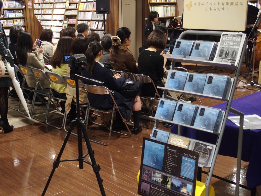 客席スペースも広くとってあり、そして今回は座席も並べてありました。そしてその脇には、今回リリースされた 4th.CD『Voyaging』を陳列させておきます。正にこれはこの日の為に作られたステージで、インストアライブという状況にプレミアム感を出す事に成功させていました。既にフロア内のBGMは『Voyaging』のものに切り替っており、クラシックフロアで流れるのも悪くない…等と思っていたりしたものでした(笑)。