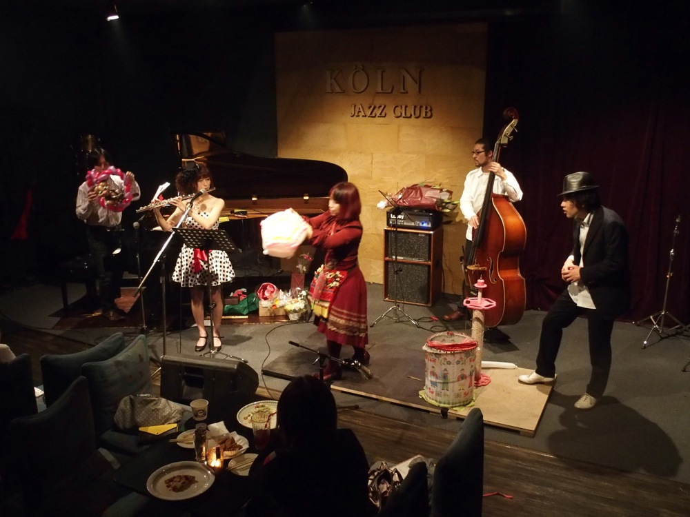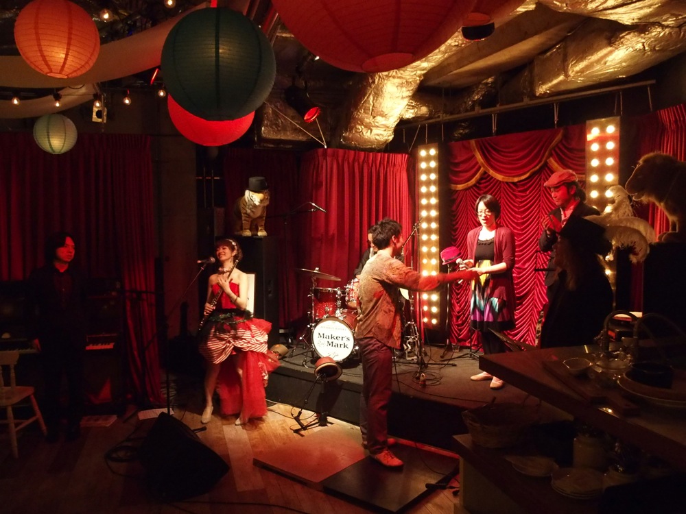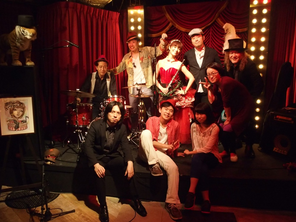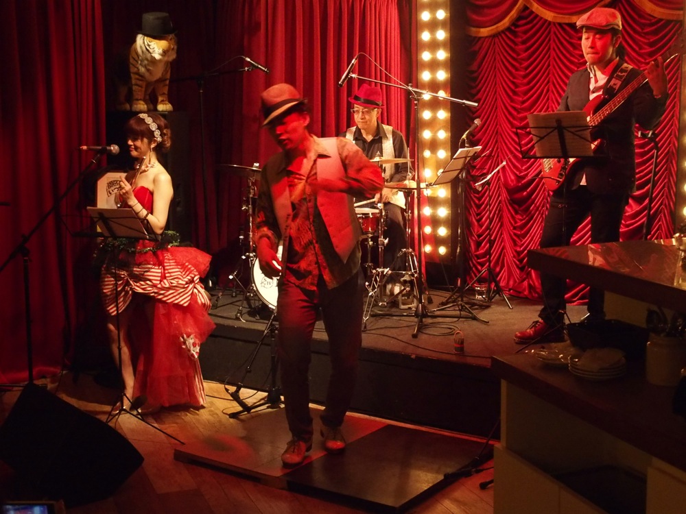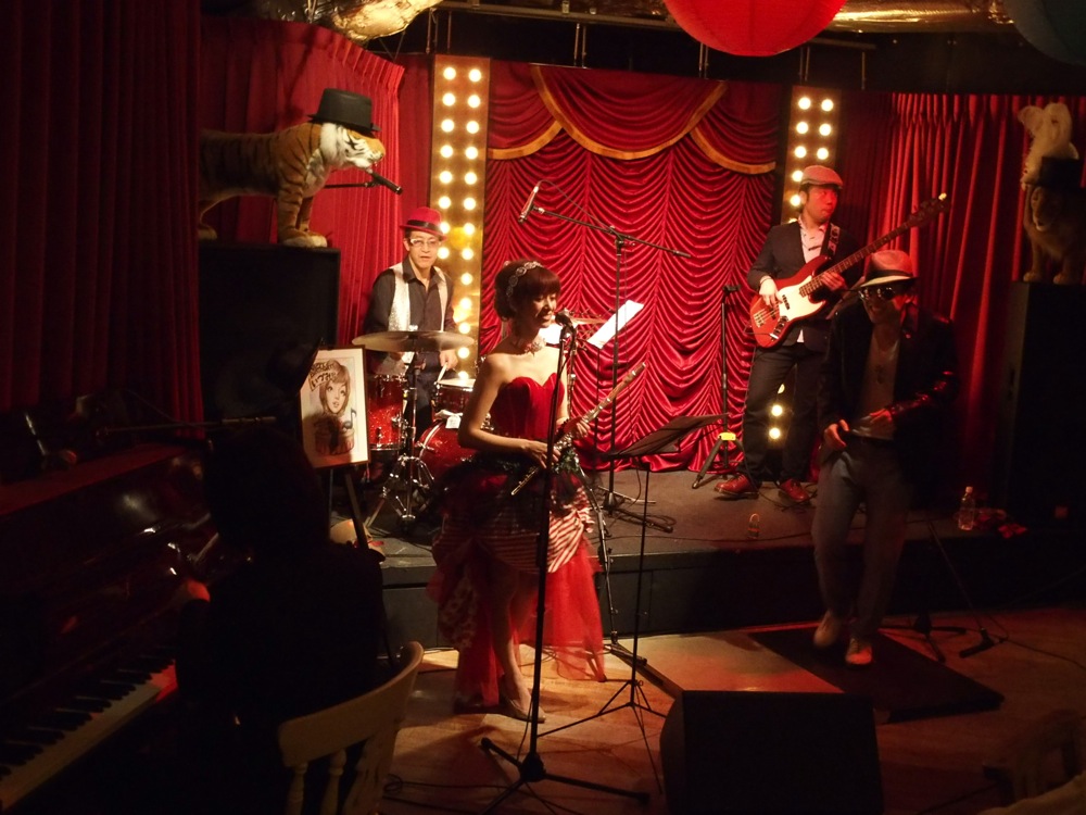 そして第3日目となったのが、実際の?誕生日直後の4月25日。再度、舞台を東京に移し、渋谷にある The Guinguette by MOJA というお店で行われました。ここは昨年のクリスマスにもライブをやりましたが〔弾楽、渋谷 The Guinguette by MOJA でクリスマスライブ参照〕、今回は弾楽のメンバーではなく、ベースは石川慎一郎さんにお願いし、また、チッコソウマさんも加えて、全部で5人編成でお送りしていきました。サーカスのような、フランスのキャバレーのような、独特のこのお店で行われるバースデー・ライブは、他の2日間の時とはまた異なり、とにかくパーティー感が全面に押し出された1日になったと思います。いづみさんの写真の衣装は手作りらしく、何とこの日の朝に作ったのだとか…。流石、この日に力を入れているだけありますね。ちなみに、この日は2度の衣装チェンジが行われました(笑)。