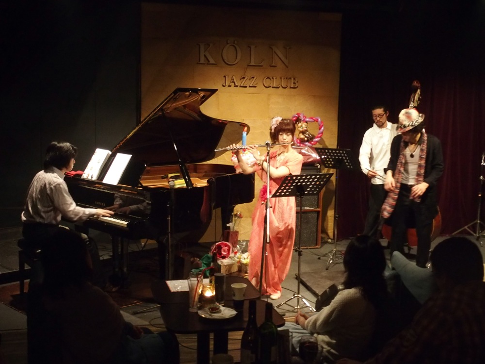 第2日目は富士の Koln(ケルン)にて、前述の1週間後の4月11日に行われました。昔から存在する、非常に有名なジャズのライブハウスで、今年の1月に自分の誕生日も祝って頂いた事〔弾楽で、35歳のバースデーを祝われる参照〕は記憶に新しいです。弾楽は、どちらかというと静岡県内でのライブが多いバンドで、ある意味でここはホームと言える場所でもあるのです。昔から足を運んで頂いてる方や、何度か自分達が訪れる内に知り合いになったお客さん等、本当に沢山の方々に囲まれ、温かみのある時間を過ごせたと思います。