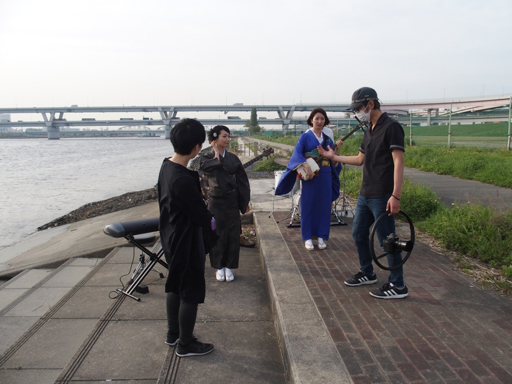 その後、土手から河川敷へと撮影場所を写します。背後には広大な荒川の川面が迫り、先程とは変わって開放的な雰囲気が作り出されていました。日も傾きかけて焦ってきますが、そもそも西日というのは撮影に向いている状況なので、かえって良かったのかもしれません…。ここでもバンドメンバー全員の演奏風景を撮りましたが、メインはどちらかというと、それぞれソロでの撮影。ここでは楽器を持たないでの完全なソロ撮影だったので、若干の演技力も要求されたりしたのですが(笑)、黒船PVに新たなシーンが表れてくるのかもしれませんね…。