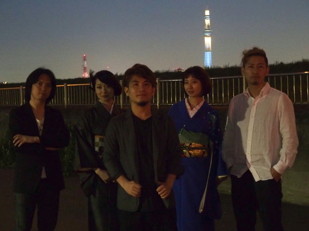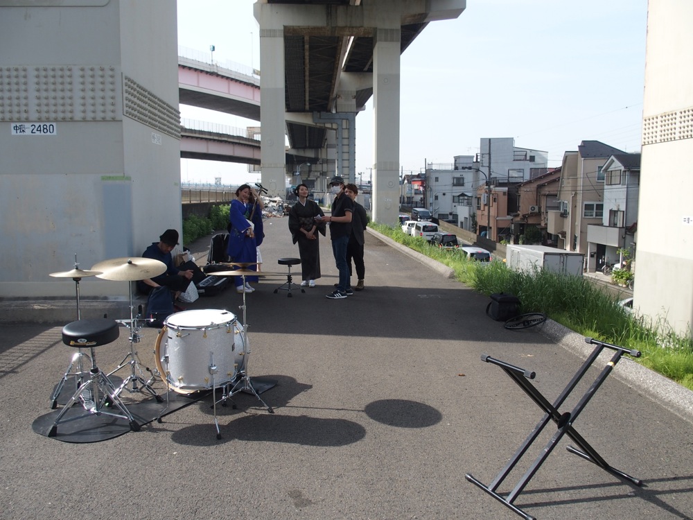 人通りは殆ど無い場所でしたが、車も入れる場所では無く、当然の如くキーボードやドラムはここまで運んでこなければなりませんでした。しかも、途中からは場所も変えて撮影を行うとの事で、楽器運搬の移動はなかなか大変でした。その代わり、撮影環境はまずまずと言ったところでしょうか。川の向こうにはスカイツリーが臨めましたが、恐らくこれはPVには写らないように工夫させるかもしれませんが…(笑)。