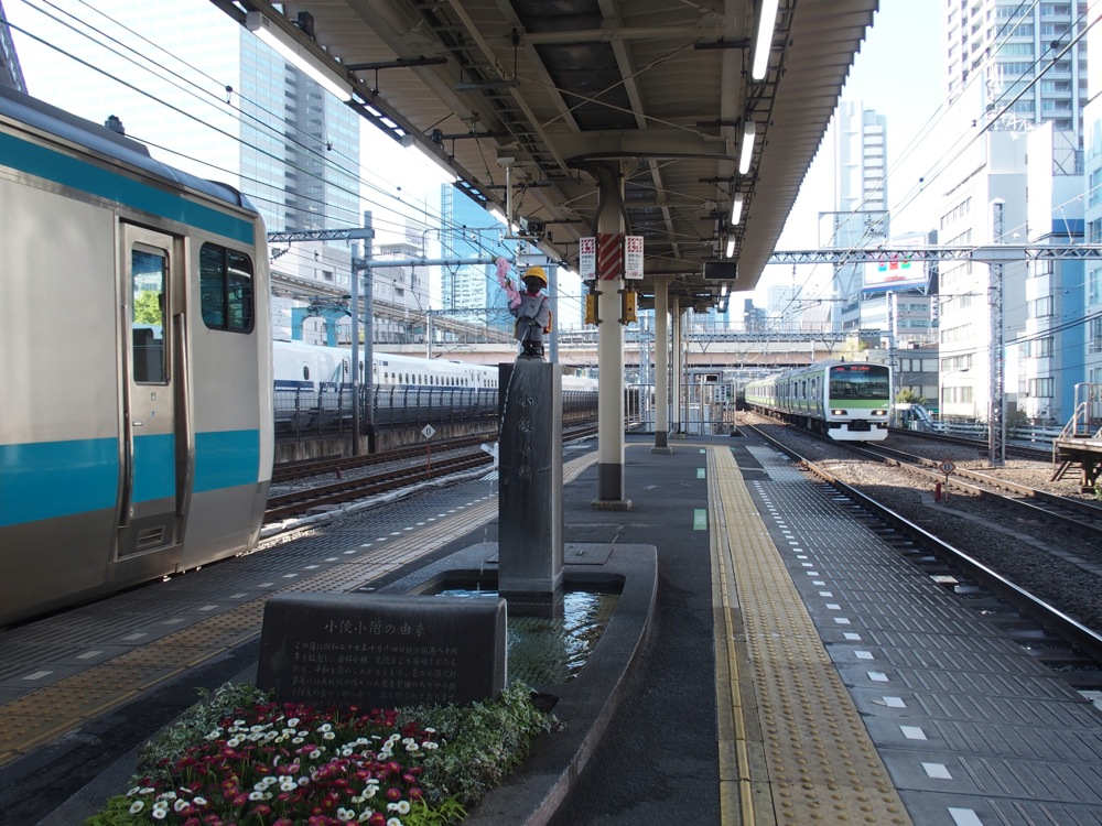 今度はJR山手線の列車で浜松町駅に向かいます。浜松町駅は、JR東日本グループになった東京モノレール〔鉄道さんぽ 6.(東京モノレール羽田線編)参照〕の乗り換え駅として利用する方も多いと思いますが、JRの3・4番線ホームの田町駅寄りに、“小便小僧”の像(左上写真参照)があるというのは意外と知られていません。これは、ここに設置されてから60年にもなる結構古いもので、季節毎に衣装が変えられていて、通勤、通学客の目を楽しませている事と思います。