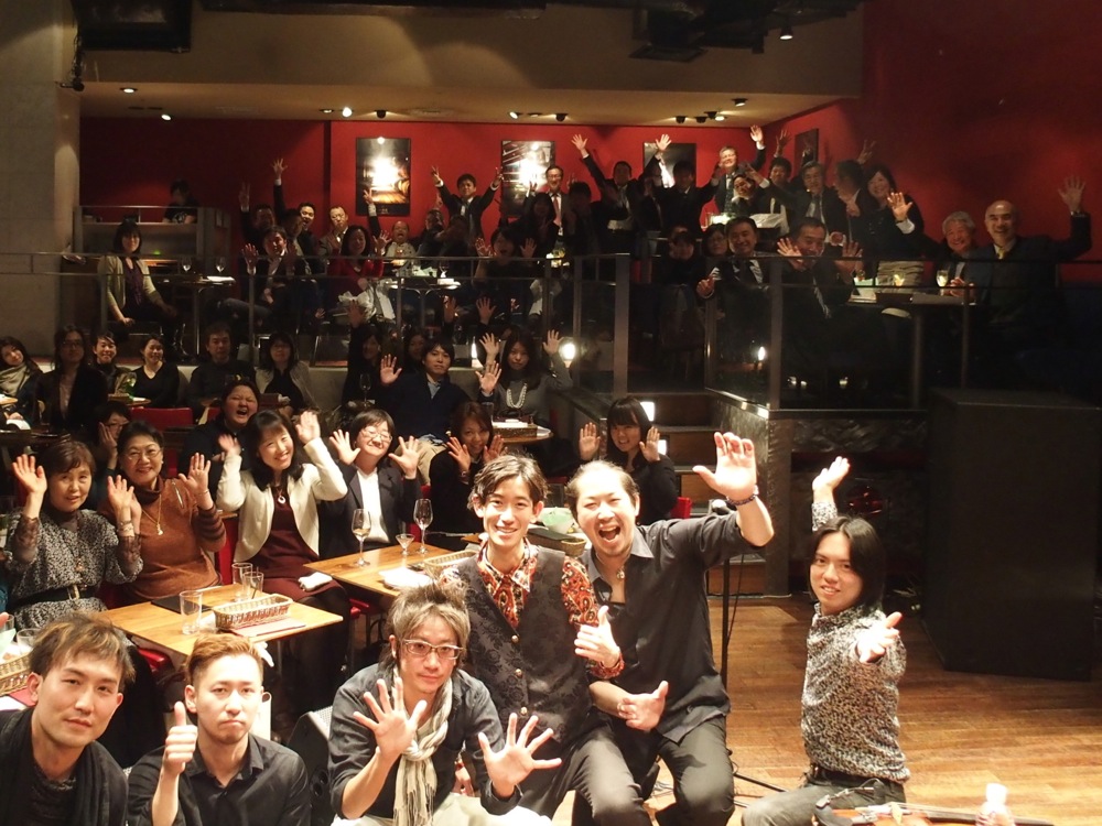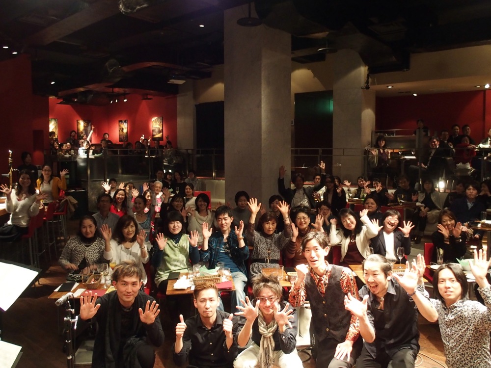 そして Tsumuzi 君が恒例にしているという、ライブ直後の、お客さんとの記念写真。1つの角度からだけでは収まらず、2枚に分けて撮影してみました。客席に後ろの方までポーズを取って下さって、何だか有り難い限りです(笑)。楽しいひと時をどうもありがとうございました♪