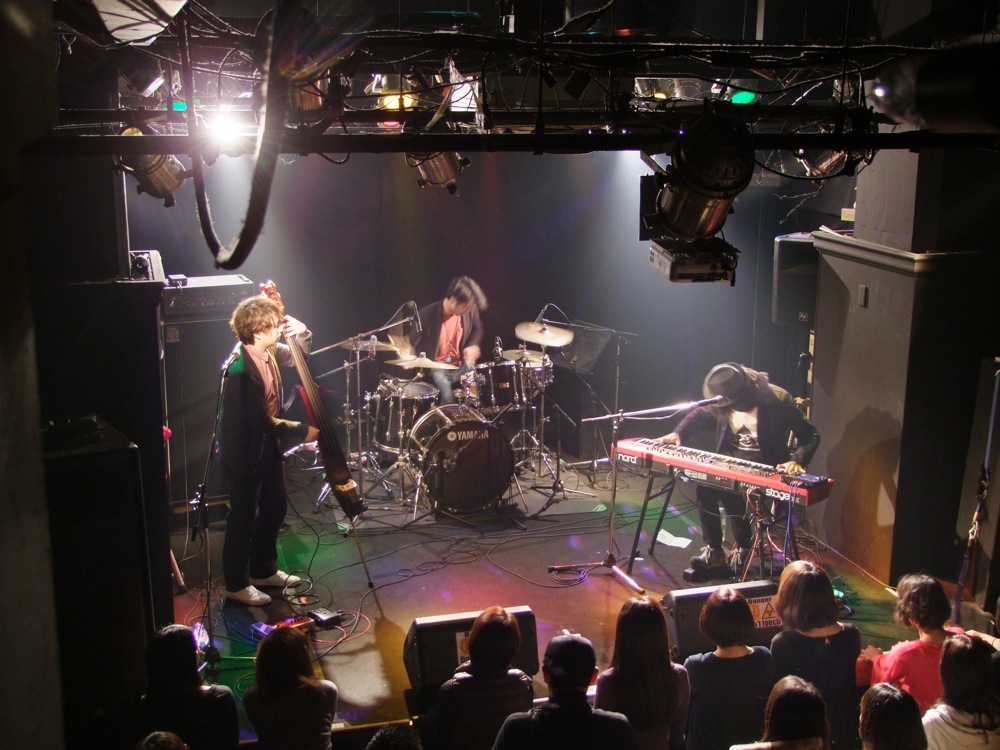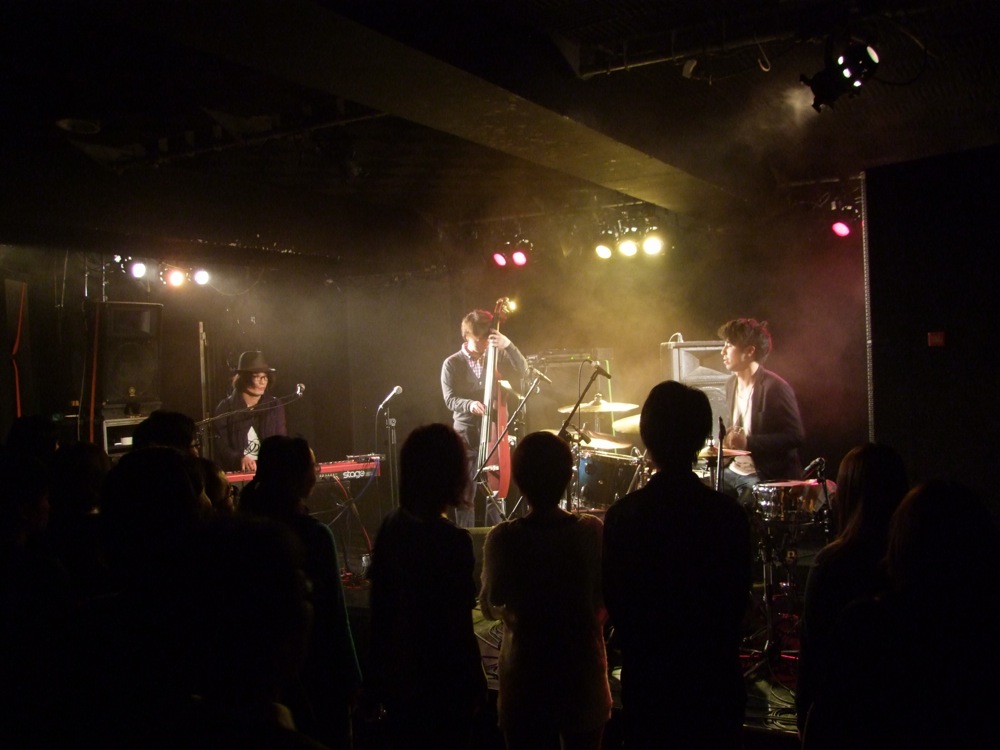 このお店の楽屋は吹き抜けの2階に位置し、自分達はステージを見下ろすような形で fox の演奏を見る事が出来ました(左上写真参照)。1曲目から全開で打ち込んでおり、恐らくこの日は逆に、fox を初めて見る方が多かったと思うのですが、既にお客さんを魅了している感じがありました。立場的には、昨日の自分達みたいな状況が、fox の今の状況に近く、どこか緊張している部分がある筈なのですが、そんな事を思わせないステージングは流石でした。