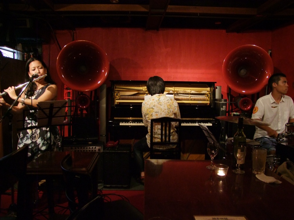 前回の Z・imagine のライブでやった時には、自分はお店のローズをお借りして演奏させて頂きましたが〔3回目の Nautilus ライブ参照〕、今回は逆に?自分のキーボードを使わさせて頂きました。ローズが駄目だったわけではありませんが、やはりパワフルな音が出るのと、ピアノの音色も使えるのが、このキーボードの強みです。Z・imagine には生ピアノもありますが、この Nautilus では生ピアノのサウンドよりは、少しリバーブを効かした鋭い音のピアノの音色の方が似合うような気がします(ステージ上のスペースの問題もありますが…)。