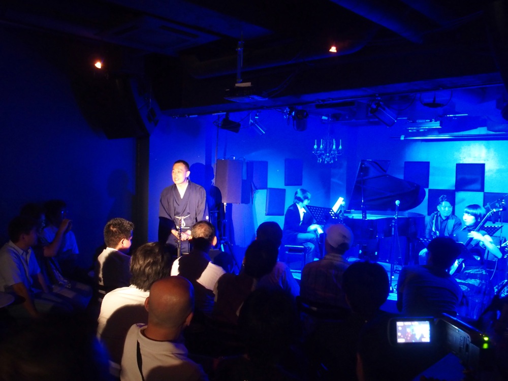 落語と生演奏のコラボというのは初めてやったと思いますが、意外に自然に合っている感じがしたのは非常に興味深かったです。落語の演目なので、粗筋は勿論決まっているのですが、それでも本番の空気感を踏まえつつ、少しアドリブ等も入れたりして、そういう意味では、自分達が取り上げているジャズという音楽に近いものがあるのではないかと思ったりもしたものでした。話しの調子に合わせて、自分達のBGMの弾き方も変わってくる…。なかなか面白い状況だったように思いました。