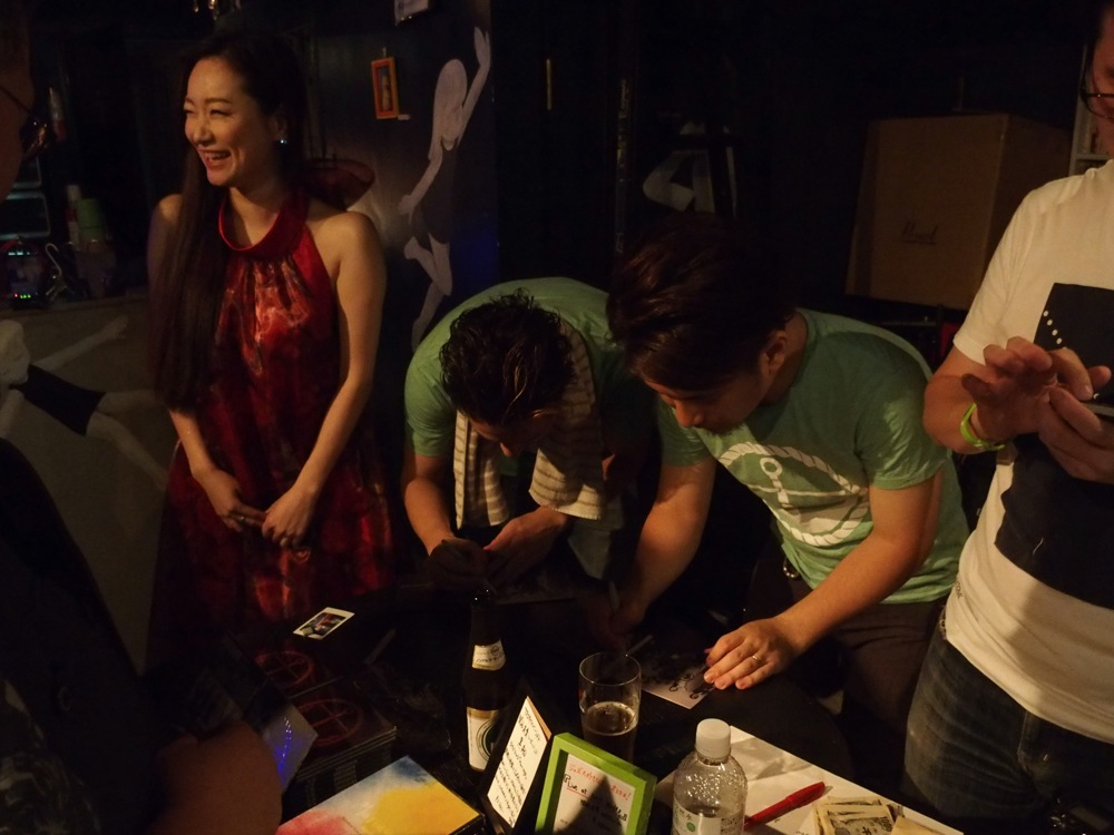 写真ですと、簡単に皆で集まれたかのように見えますが、実はこの瞬間は1時間にも満たず、予想以上にタイトなスケジュールで皆でサインをしていったのでした。ちなみに、この日は自分とドラムの佐々木俊之さんが同じライブの日で、そのライブの休憩中の時間帯を目指して、他のメンバーが現場に集まってくれたというものでした。皆の御協力に感謝です…。