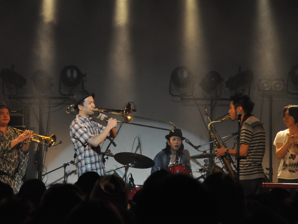 今回、カルメラ以外の出演バンドのステージには、それぞれゲストとしてカルメラのメンバーが何人か加わって演奏するという試みが設けられていたのですが、我が TRI4TH に参加してくれたのは、まずトロンボーンの棚瀬祐也君(たなっち)でした!…曲は勿論、自分達のステージのラスト曲とさせて頂いた“Dance 'em All”です。イントロの部分でのサックスの藤田君とのバトルは非常に白熱した時間だったと思います。