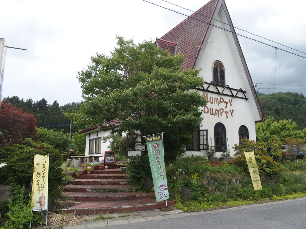 終点の1つ手前の関所跡というバス停で下車すると、先程からチラチラ見えていた赤谷湖の姿が眼下にありました。夏にはここで花火大会が行われ、昨年はそれをバックに郷原君がサックスを吹き続けたらしいですが(笑)、このバス停から歩いて5分程で、Humpty Dumpty はありました。尖った三角屋根が特徴の建物で、これは遠くからでも結構目立ちそうです。ここでやっと郷原君と合流し、Kie さんとも久し振りの再開を果たし、そして早速リハーサルへと突入させるのでした。