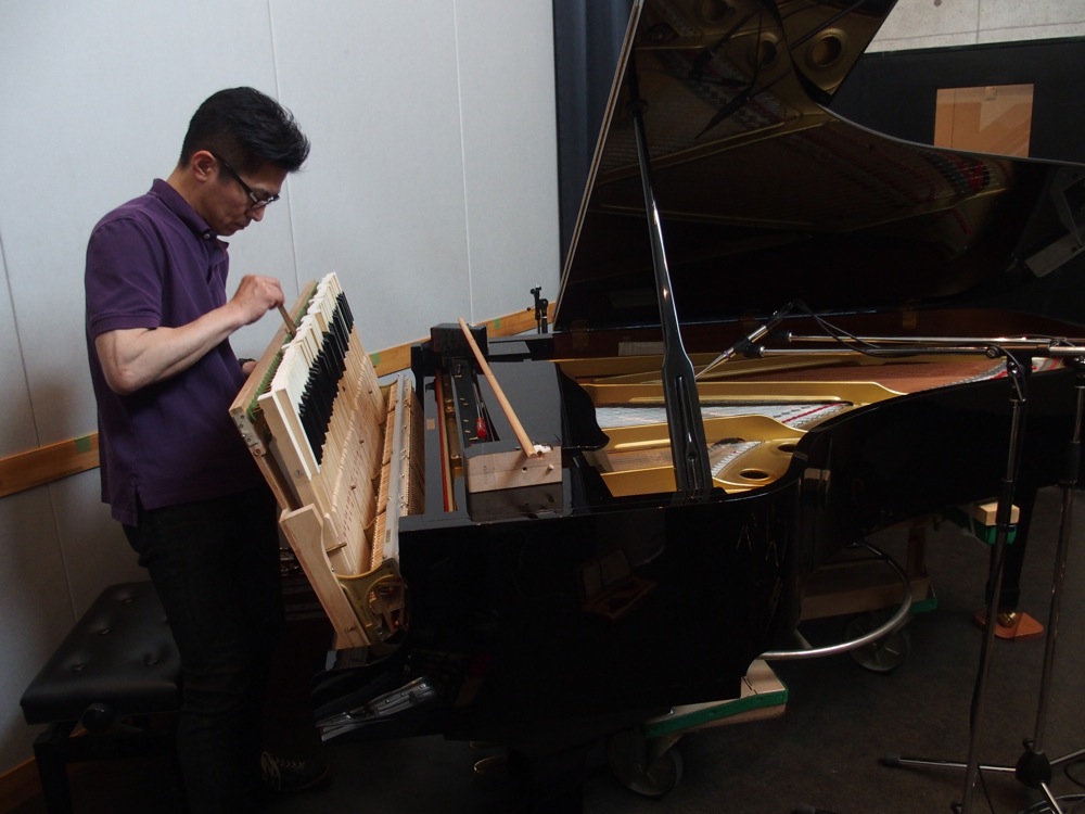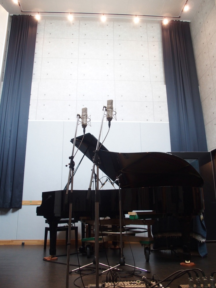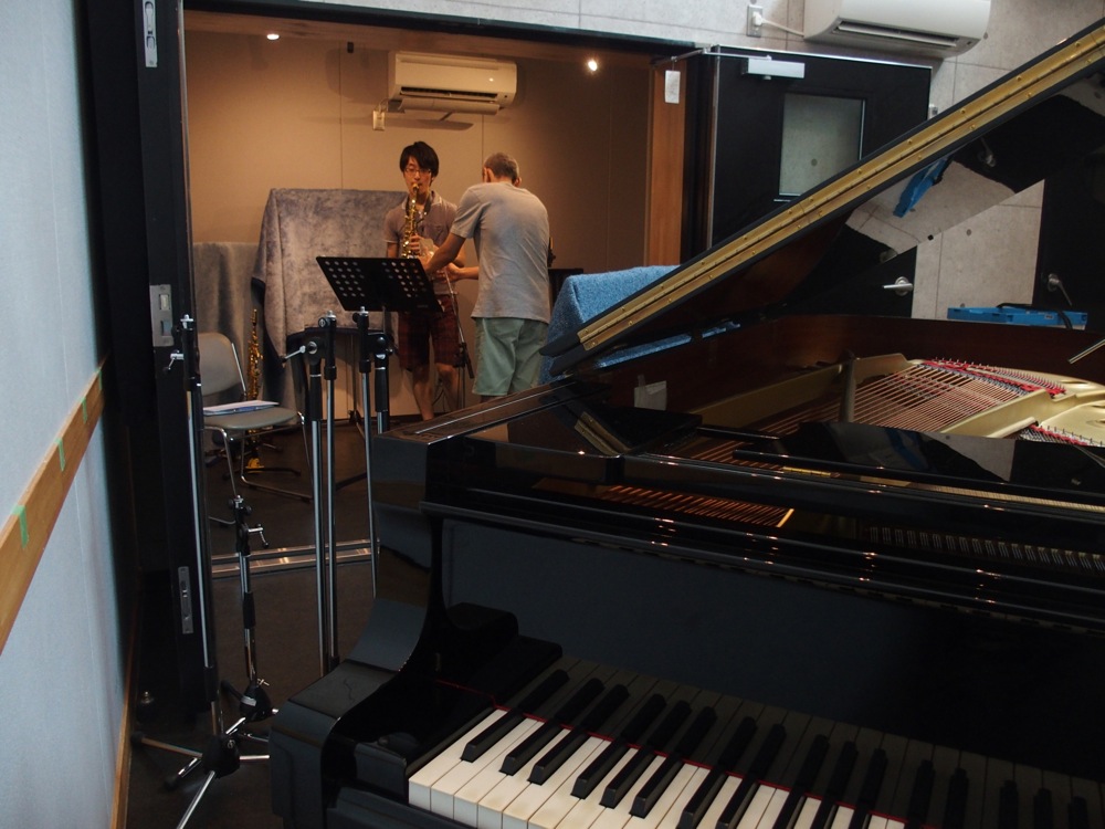 今回のレコーディングに使わせて頂いたのは、TRI4TH〔TRI4TH、オリジナル3rd.アルバムのレコーディング参照〕や竹内トリオ〔ピアノトリオ、カバー曲レコーディング参照〕でもお馴染みになってきた、オルフェウススタジオです。使い慣れたスタジオではありますが、デュオ編成での録音というのは勿論初めてでした。それぞれのブースが存在するスタジオですが、今回は敢えて、いつもドラムが置かれている一番広い部屋にグランドピアノを移し、普段ピアノが置かれている部屋をサックスのブースとして臨んでみました。どうやらピアノの響きの広がりが全然違うらしく、それは実際に弾いてみても如実に感じられるもので、そもそも広い部屋での録音というのは、状況的にも非常に気持ちの良いものだったのです…。いつもこの場所でやりたいものですが、ドラムが有る限り厳しいかもしれません…(笑)。そして、敢えてサックスとの間のドアは開けっ放しにし、お互いの音が入り込む事で、よいライブ感を表現する方向へと持っていきました。なかなかスリリング且つ、楽しい状況ではありませんか!