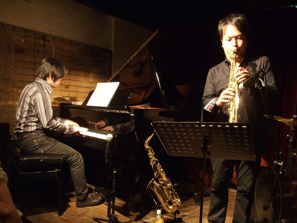 前回副田君に加わって貰ったライブは、トリオメンバーだけの曲もやらせて頂いたのですが、前述通り、今回は副田君には最初から参加して貰い、もう『竹内大輔カルテット』と言っても差し支えないかの如く(笑)、ライブを進めさせて頂きました。そんな1曲目は、トリオとしては久し振りに演奏した“New Life Standard”。今回のライブは絶対に盛り沢山になると予想出来たので(笑)、最初の1曲目は軽めにいこう…なんて事前に話していたのですが、いざ音を出したら何だか楽しくなってきてしまいまして、結局はいきなり1曲目からガッツリと弾かせて頂いた感じでした(笑)。これはもう、ライブだから仕方無い状況のように思いますね…。そして2曲目に“The Night Visitor”、3曲目には“Everybody Knows That”と続きましたが、勿論これらは副田君は初演奏の曲ばかりです。それぞれに、サックス1管用のアレンジを施しまして、違和感無くそれまでのトリオ演奏に溶け込めるように配慮させました。