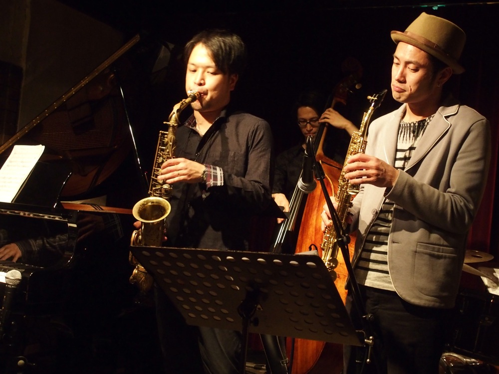 アンコール曲には、せっかくだったので藤田君にも参加して貰いました。当然の如く、当初は参加させる予定ではなかったので、楽器は持ってきてなかったようですが、この日の副田君は、アルトとソプラノの2本でライブに臨んでいたので、その内の1本(ソプラノ)を藤田君に貸し出し、ここだけのクインテット編成が出来上がったのでした。曲は、セッション曲としてよく取り上げられる“Strasbourg Saint Denis”で、2管ならではのアンサンブルを心地良く披露してくれました!…ちなみに、これはフランス語で「ストラスブール・サンドニ」と読むのが正しく、パリにあるストラスブール大通りと、サン=ドニ通りの交差付近に位置し、パリのメトロの駅名にもなっている場所でもあります。何気に、パリ繋がりの選曲でもあったのでした♪