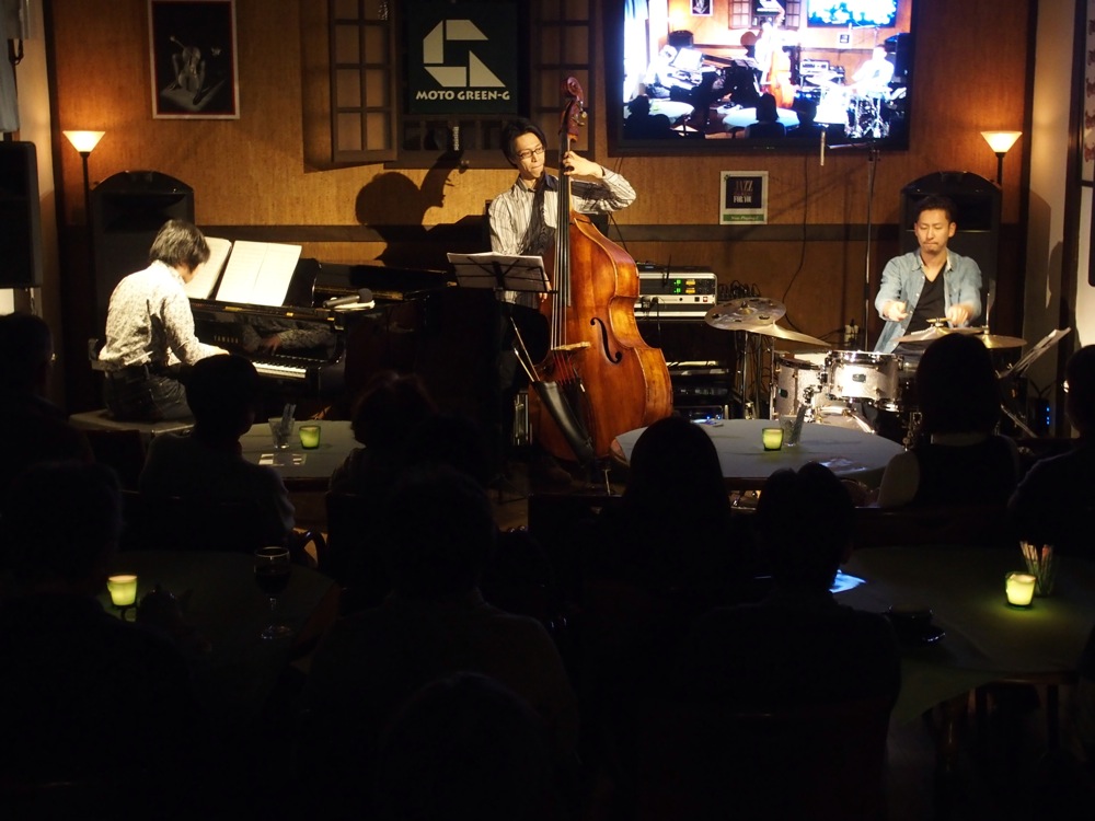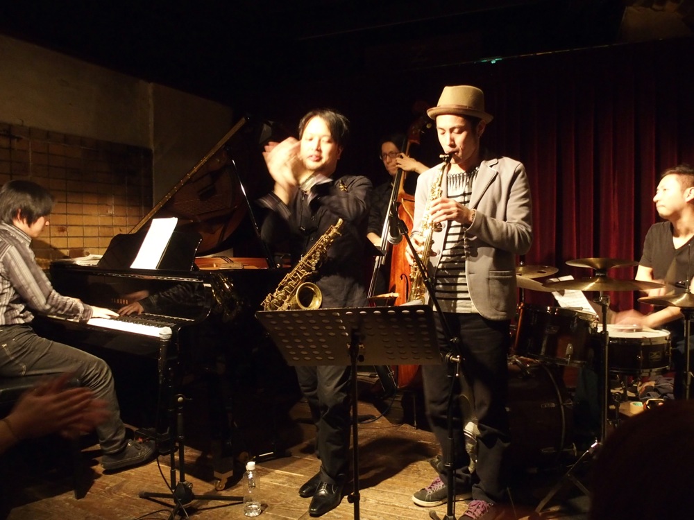 そして4曲目には、トリオでは初披露となる副田君の新バラード曲、“Quintessence”をやらせて頂きました。意味は“真髄”で、副田君らしい、メロディアスで説得力のある曲だったと思いました。やはり作曲者によって曲の個性はハッキリ出ますよね。自分のオリジナル曲が続いた中での選曲だったので、良い変化球を付けられたのではないかと思います。そして1ステージ最後の5曲目に、トリオでもよく演奏している“Tombo in 7/4”。テンポの速い7拍子の曲と、なかなかハードルが高い曲ですが、見事、初緒戦の副田君も吹き切ってくれました。ピアノとのメロディの振り分けや、お互いのソロの掛け合いの部分を作る等、既存のトリオ演奏とはまた違った見所を提供してくれたように思いました。