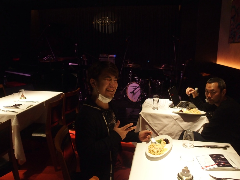 上写真は、リハーサル後のスタジオのロビーにて…。ここのスタジオは、ポイントが貯まるとドリンクと交換出来、しかもその中には生ビール(大ジョッキ)も含まれるという、素晴らしいシステムのスタジオです(笑)。これでまた気合いが入るというものでした。