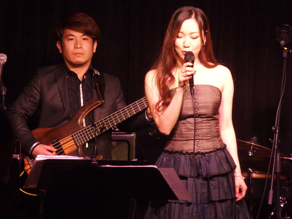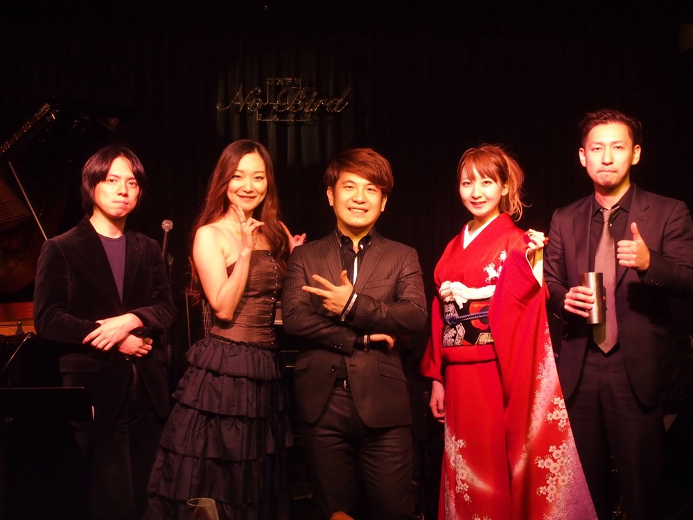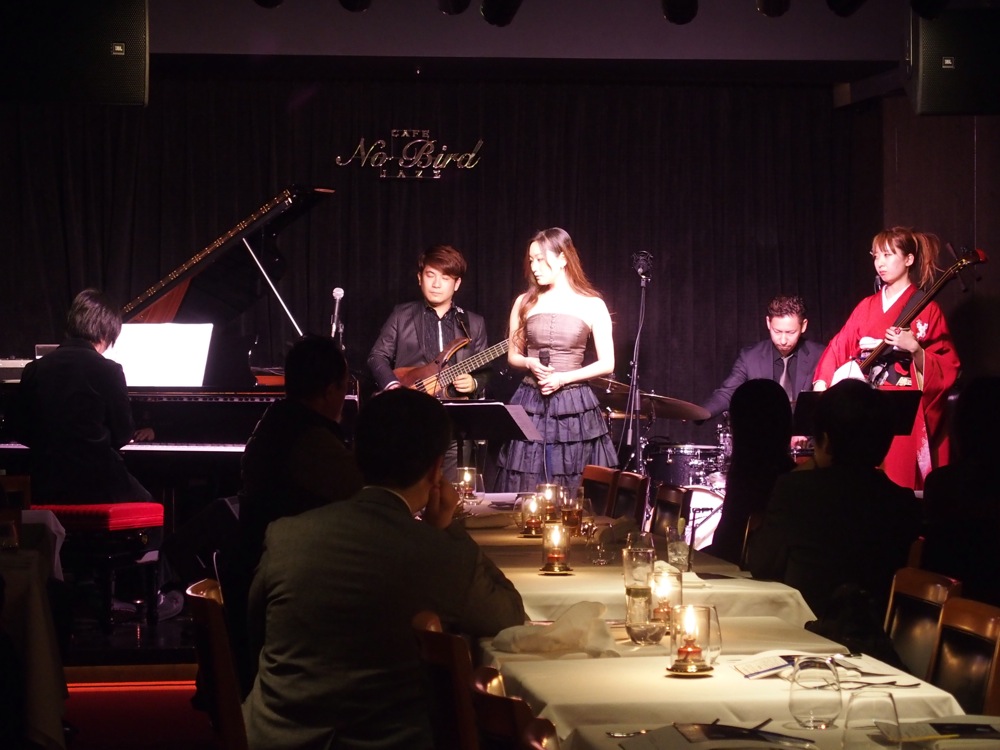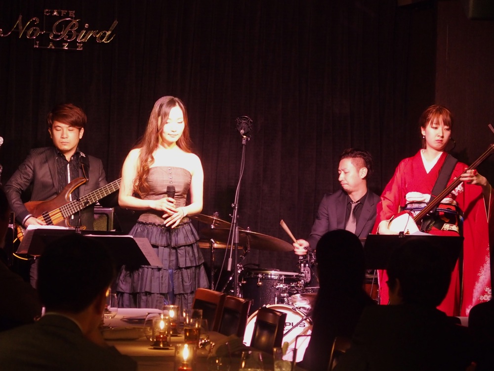 お店は No Bird という、個人的にも初めて出演させて頂きました。銀座だから…というわけではないですが、今回の衣装は、男性は黒スーツで統一、そして白藤さんは鮮やかな赤色の着物、ボーカルの里アンナさんは、地元奄美の服である大島紬のドレス…と、各々気合いの入った出で立ちでステージに上がり、そもそもが複合する音楽をテーマにしている黒船の“らしさ”を紹介する事にもなりました。