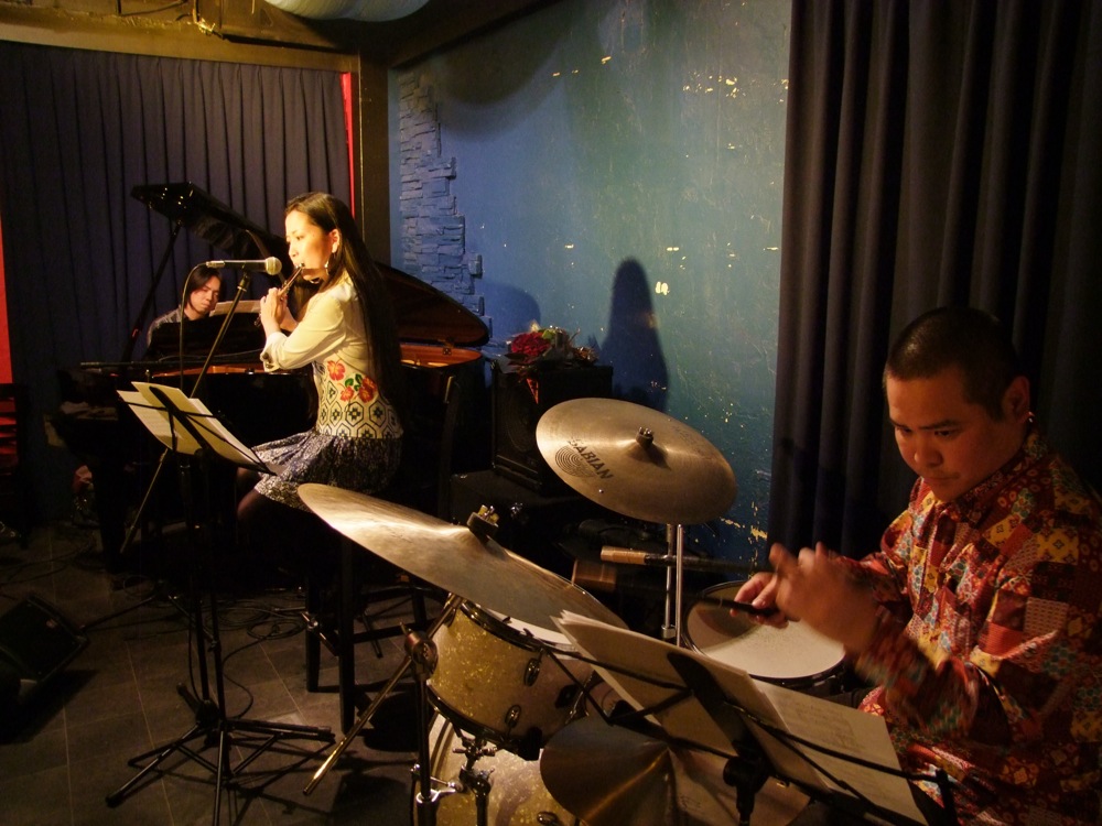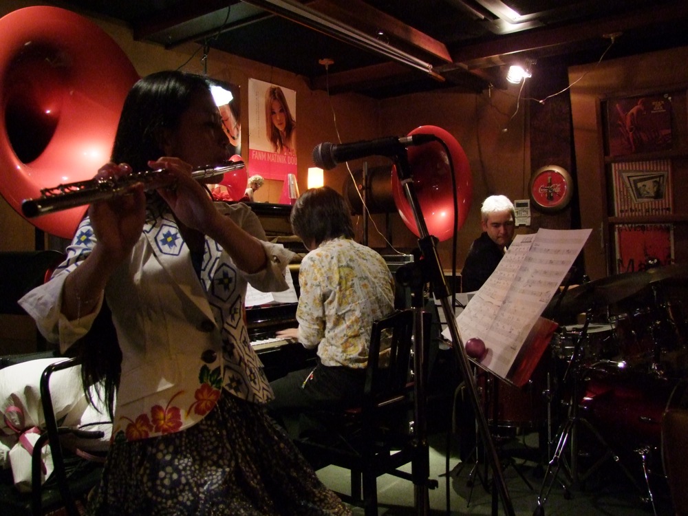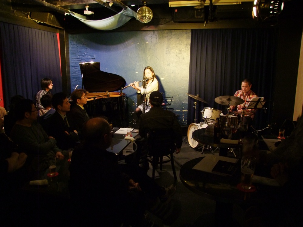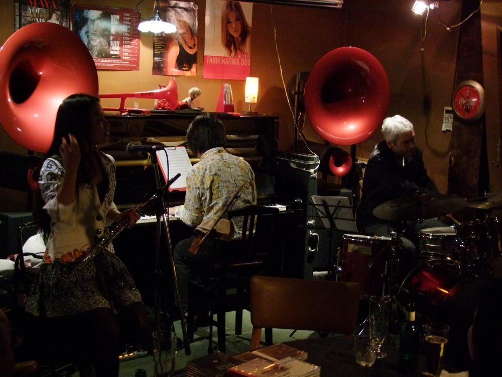 中に入ってみると、これまた以前よりモダンな雰囲気になっています。以前は、もっと蔵そのものな感じだったのですが、壁紙が張り替えられたり、様々なポスターが貼られる等、少し垢抜けた印象かもしれません。そして何と言っても、ピアノがグランドピアノになっており(以前はアップライトピアノでした)、何だか凄そうな音響機器が入っているではありませんか。当初、現地にある機材はピアノだけ…と聞いていたので、生音に近い感じでやるんだろうな…と思っていたのですが、むしろパワフルなアンプと立派なスピーカーが設置されていて、逆にドラムだけが無い場所…と考えた方が正しいような、そんな環境のステージでした。ライブは月に1、2回程度しか予定されていないだけに、何だか勿体無いような気もしましたが、この日は思い切ってやっていこう!…という気合いの入った瞬間にもなりました。