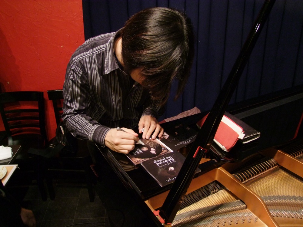さて、今回は全2ステージを行いまして、竹内大輔ピアノトリオのCD収録曲を中心に演奏させて頂きました。1ステージ45分程度の時間を頂いていまして、これは普段やっている1時間ステージからすると、コンパクトなサイズであったわけですが、曲を少なくするというよりは、1曲を短めにして、曲数は維持しよう…という方向にし、自分達がやっている音楽を色々な側面から披露していきました。やはり、カバー曲を演奏した方が喜ばれる傾向はあったようですが、オリジナル曲も結構好感触だったようで、ライブ後、「あのイタリアの曲は…」、「あのグアムの曲は…」という声を頂き、CDを購入して頂いたりもしたので、やはり自分達のやりたい音楽を散りばめていったのは正解だったのかもしれません。最初から最後まで、お客さんと楽しい時間を過ごす事が出来ました。