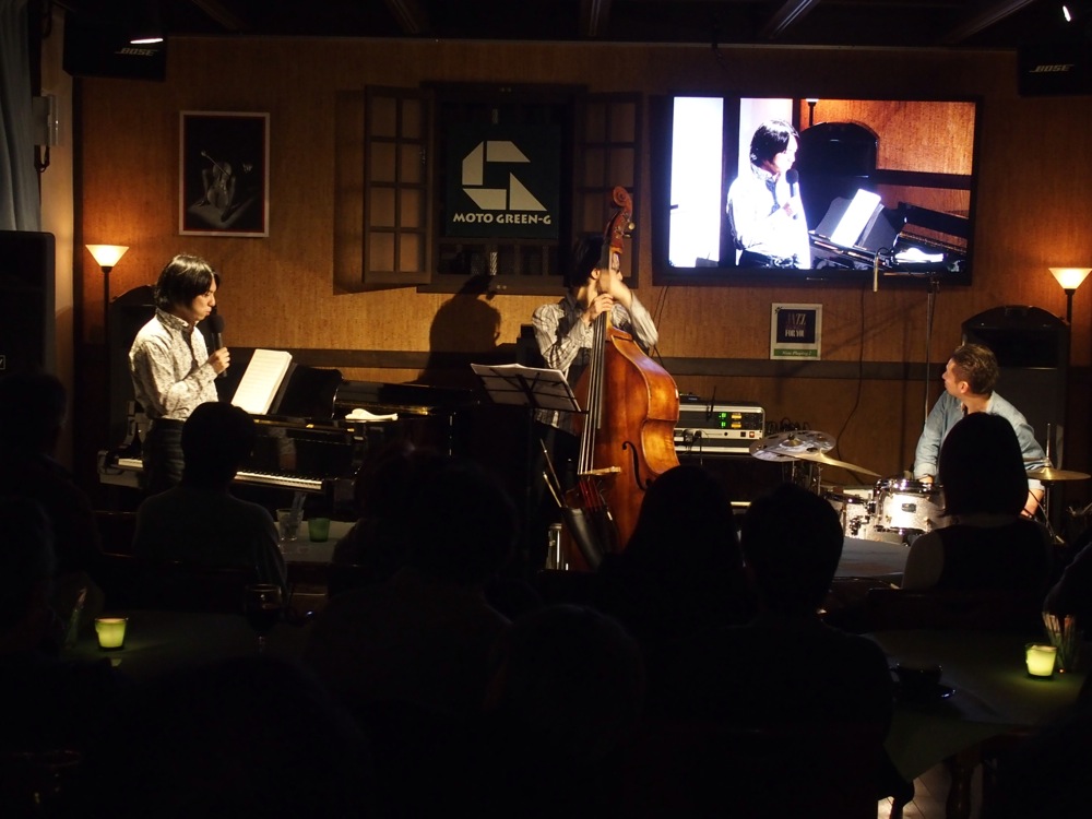 ステージ奥の壁には上写真の通り、かなり大きめのディスプレイが設置されているのですが、これは自分達が演奏しているのを映しているもので、しかも定点撮影ではなく、演奏のシーン毎にカメラワークを考えて映してくれているものでした。ただ、この位置関係を見れば分かると思いますが、自分はピアノを弾きながら、このディスプレイを拝見する事が出来ます…。そして、例えばピアノソロ中に画面に目をやると、自分の演奏姿がアップで映し出され、更にカメラは手元に寄っていく…と、なかなか特徴的な状況が展開されていたのでした。自分で自分の演奏を、画面越しにタイムリーで見る…という環境はまず無いので(笑)、何だか面食らってしまいましたが、このディスプレイも画質が良く、そして恐らくハイビジョン撮影だと思うので、ついつい見入ってしまったのでした。実際との動きのズレも、無いに等しい感じだったので、例えば池田君を見る時も、ついついディスプレイの方を見てしまうような(笑)、そんな状況でした。不思議な空間でした。