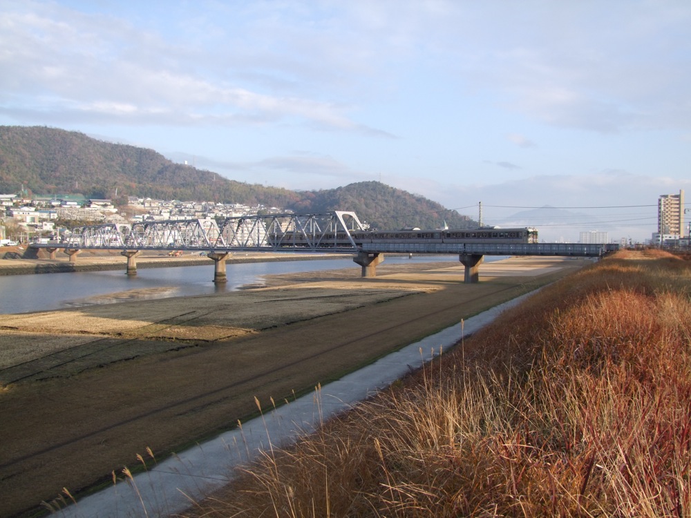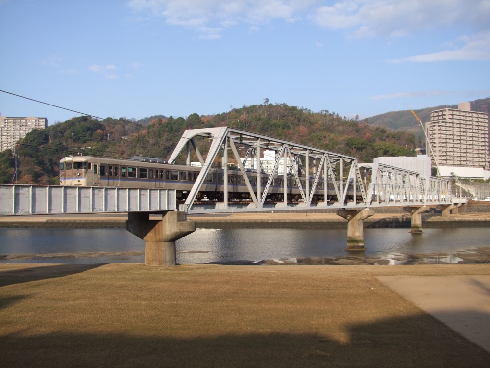 上八木駅を出ると、右にカーブして再度太田川を渡ります(下写真参照)。川沿いに出ると、見晴らしの良い景色が広がっており、川下側を見ると、遠くにJR芸備線が走っているのも見えたりします。どちらも列車は広島駅から運行されており、この辺りでは両線が接近している区間でもあるという事です。