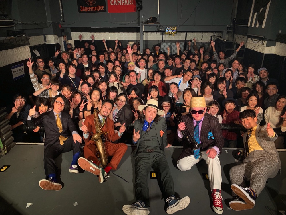ここでは個々のバンドでのステージ写真より、ラストの全バンドのコラボセッションの写真を載せた方が、この日の雰囲気は伝わると思います。最初はそれぞれのホーンメンバーを中心に出て貰えたら…という感じではあったものの、結局は、出れる人全て…が、ここには集結していました(笑)。最後のバンドは JABBERLOOP だったので、彼等のバンドの上に大人数が乗っかる…という感じでしょうか。正に大団円に相応しい状況だったと思います。ソロは、全員で回したかもしれません。JABBERLOOP の“ナナナ”にのせて、とてもドラマティックな展開で見せられたステージとなりました。