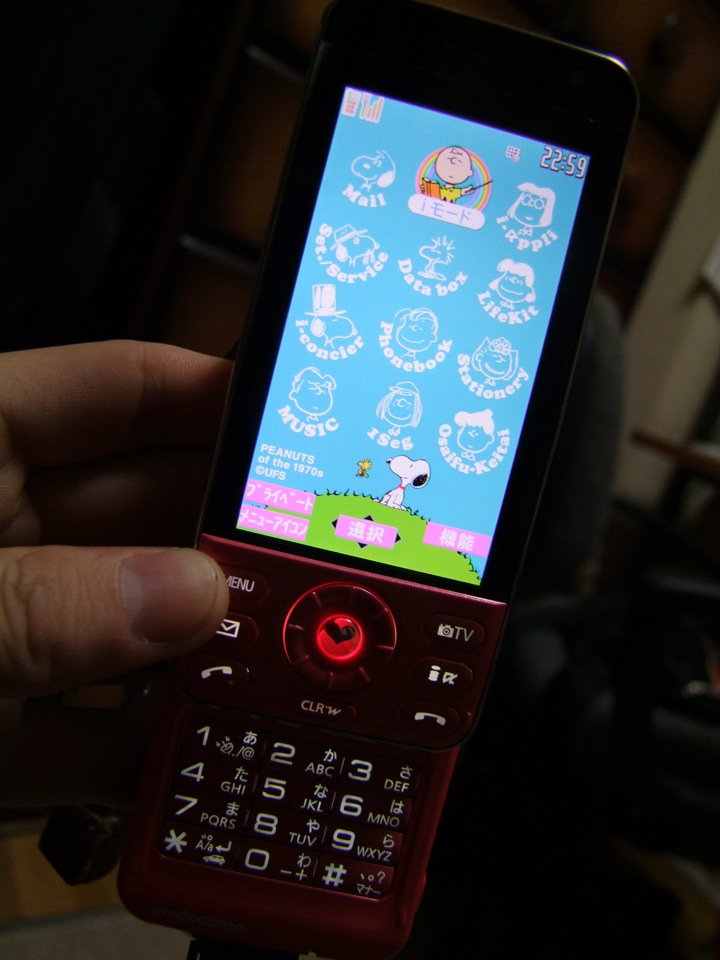 そして嬉しい誤算だったのが、この携帯、スヌーピーの“きせかえ”が用意されていて、待ち受け画面やメニュー画面等を、スヌーピー仕様にする事が出来るのです!…そこまで調べて買ってなかったので(笑)尚更だったのですが、実は自分、スヌーピーが個人的に好きなのです。…とは言え、グッズを集めているほど熱狂的…というわけではないのですが、ただ、何となく好きなのです…。そして、それを察知したかのような、この仕様…。暫くはこの携帯電話の虜になってしまいそうですね(笑)。これで気持ちを新たに、来月頭から控えている自分の北九州ツアーに臨めそうです!
