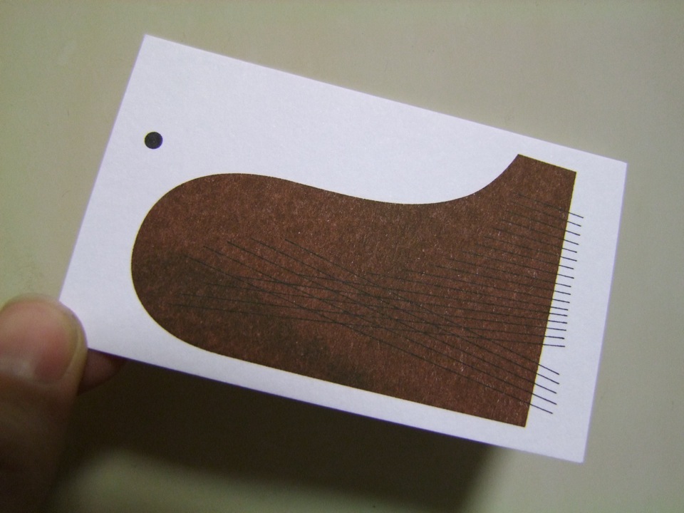 …はい、靴ではなく、靴下でもなく…ピアノのデザインです(笑)。ちょうど本物のグランドピアノのように、弦が交差に張り巡らせてあるのが分かるかと思います。流石に、電話番号とか名前とか書いてある側を見せるわけにはいかないので(笑)、こちらだけの披露とさせて頂きますが(まあ、表は字だけですが…)、シンプル且つ、表現したい事も分かりやすい感じなので、自分としても気に入ってます。
