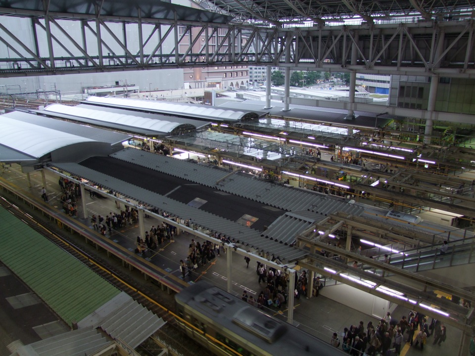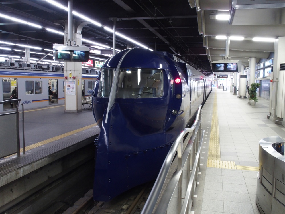 フライトはほぼ快晴という空模様だったものの、関西に近付くにつれ、少し雲が出てきたような天気になってきました。まあ、それでも晴れとは言えるような状況だったのであまり気にしないとして(笑)、ここからどこに行くかを決めなければなりません。通常?行き先を決めていない場合、本来なら先程の機内等で少しは考えておけば良いのですが、ついつい外の景色が気になり過ぎてしまう性分の為(笑)、未だに結論は出ないまま関西空港に到着してしまいました…。ひとまず大阪中心地である難波に出て、そこまでの電車内で検討する事に致しましょうか。しかし選んでしまった列車が南海電鉄の特急ラピート。レトロフューチャーをコンセプトとした独自のデザイン車両は、外観も車内も、気になってしまう事ばかりです。これでは、まだまだ目的地が決められないではありませんか…(笑)。