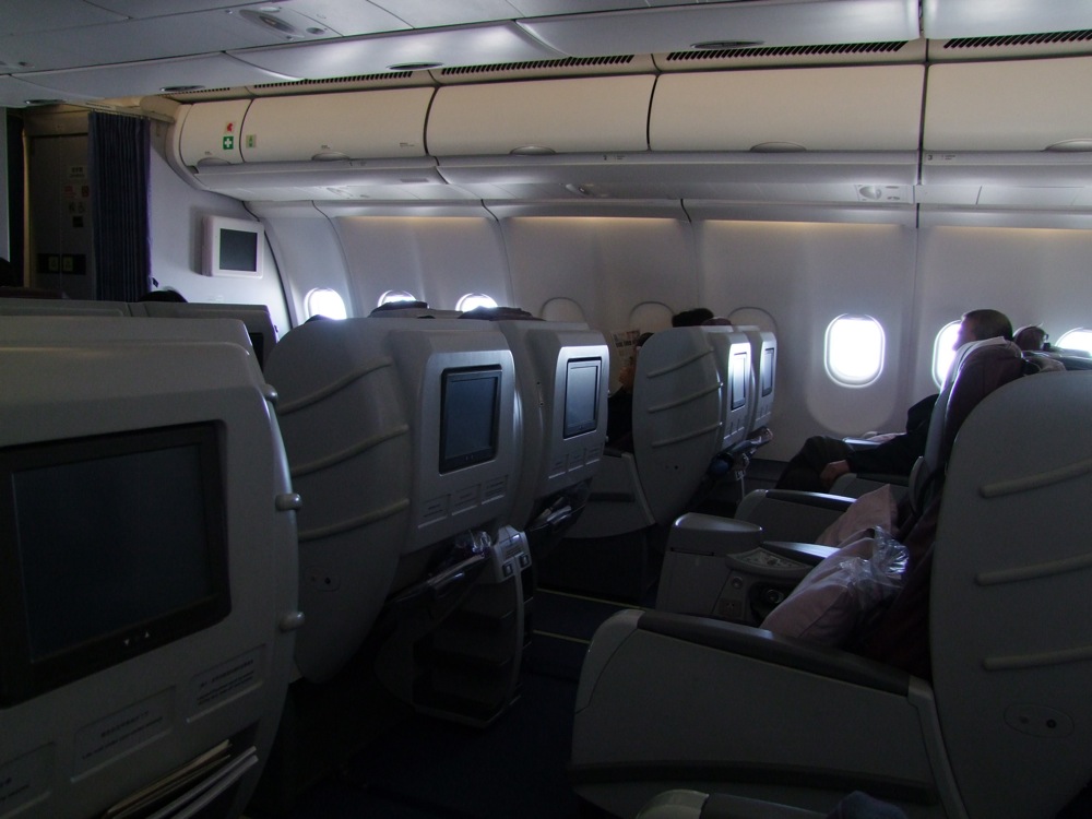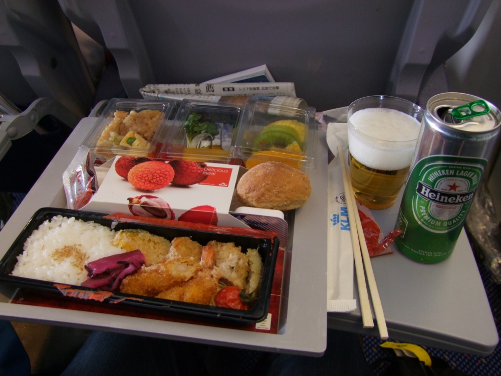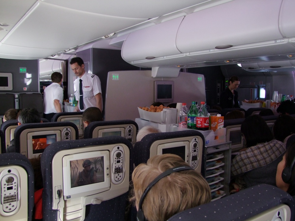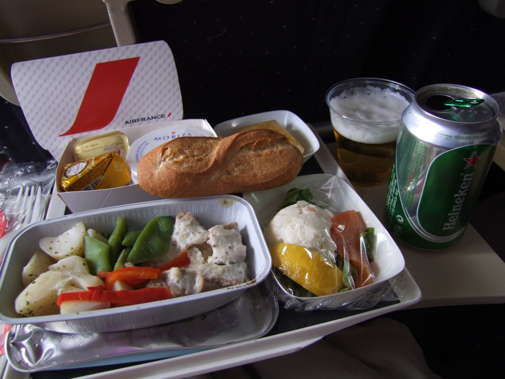 相変わらずA380の離陸は静かです。翼に近い席でしたが(窓側ゲットでした!)、通常ならエンジンの音が直に耳につくところが、遠くの所で鳴っている…という程度の騒音なのです。そして揺れも少ない堂々とした飛びっぷり…。やはり最新の飛行機というのはひと味違います。機内アレンジについては、特にA380用という目新しいものは無いのですが、それまでの機材をそのままグレードアップさせた仕様になっており、今までのエールフランスのブランドを維持させつつ、最新のものにさせるという手法が取られているようでした。お楽しみの機内食では早速ハイネケンを頂きつつ、限りある機内ので時間をゆっくりと味わいました。