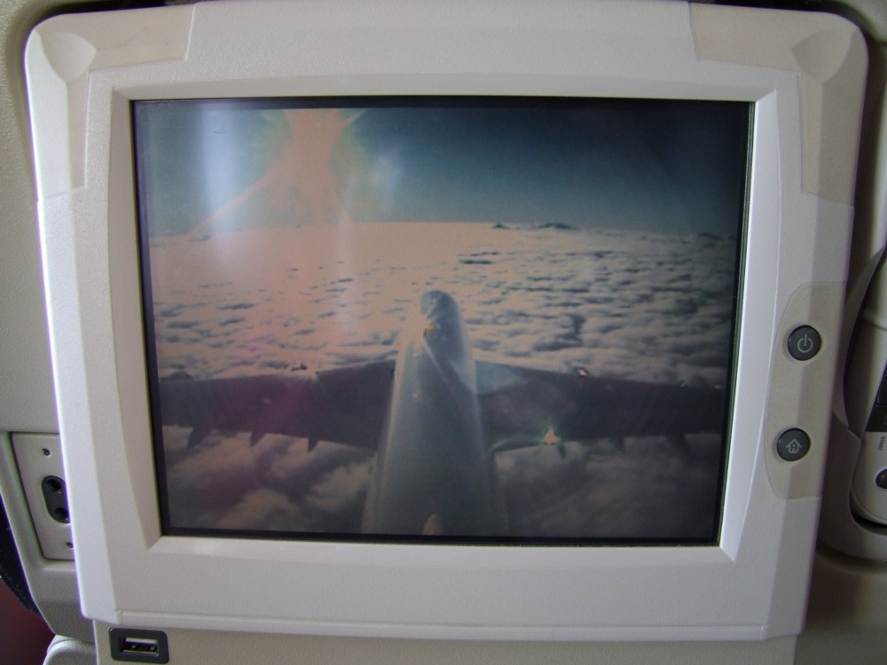 A380用として面白いのが、尾翼からの機外映像が楽しめるという事でしょうか。通常の機外映像こそ、色々な飛行機で見る事が出来ますが、A380は尾翼の先端付近にカメラが付いているのか、右上写真のような風景がモニター越しに望めるのです。勿論、ビデオとかではありません(笑)。結果的に、いま自分が飛んでいる飛行機自体を見られるという物になるので、これは結構珍しいものではないかと思います。実際はそんなに変化の無い映像が続くので、ジッと見ているという事はそんなにありませんが…(笑)。