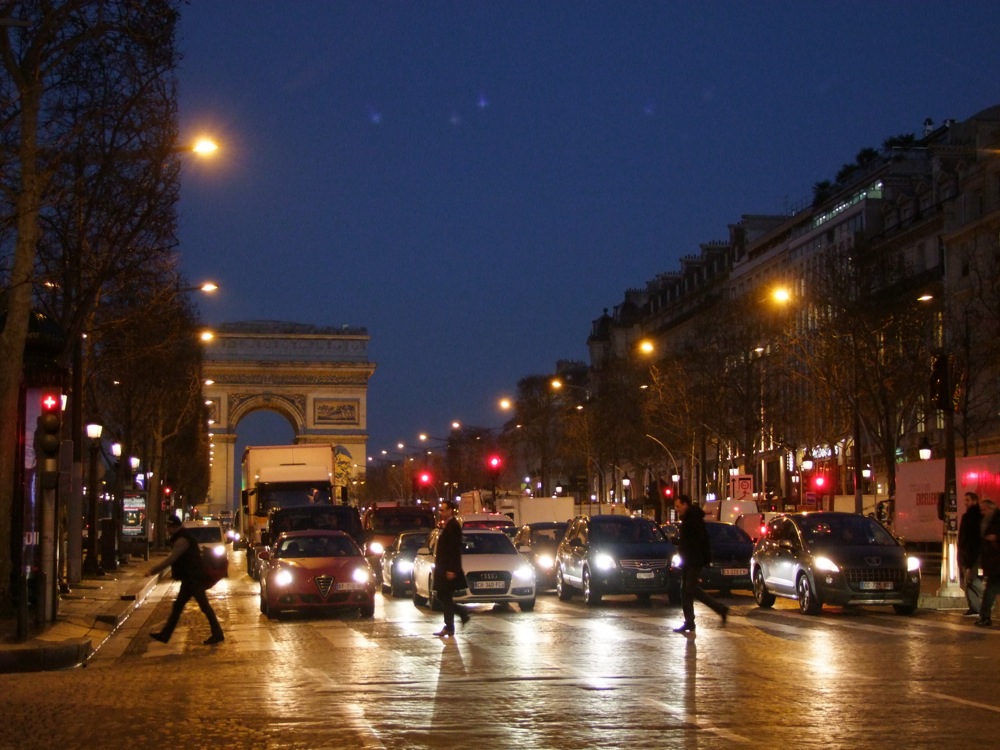 空港を出ると、そろそろ辺りは暗くなってきている頃だったでしょうか。このまま、パリ市内へのメジャーな移動手段であるロワシー・バス(左上写真参照)を使って、一路パリ市内へと向かいます。ホテルに着いたのは、時刻的には20:00近くになっていたかもしれませんが、これはまずまずの到着状況でしょう…。長距離の移動で疲れてはいましたが、頑張って力を振り絞り、シャンゼリゼ通りへと足を向けさせました。そして、シャンゼリゼ通り越しに見る、久し振りの凱旋門…。そこはパリを簡単に間近に感じられる光景でもありました。…さて、今回の日程は、どのように使っていきましょうか。
