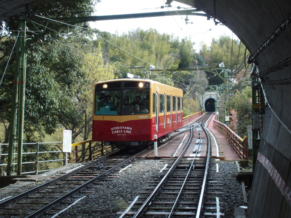 まずは、山の上に位置する石清水八幡宮に向かいましょう。意外と小さな駅だった八幡市駅を降りると、そこに横付けされているようにケーブルカー乗り場があります。京阪鋼索線という、これも京阪電鉄の路線の1つとなっています。以前の京阪電鉄の特急車両の塗装がケーブルカーに施されており、京阪の路線である事を主張しているかのようです。
