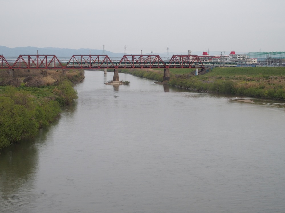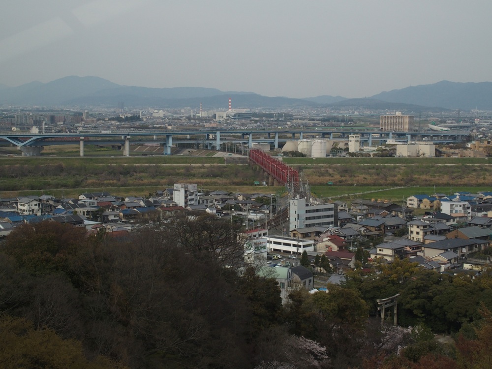 ビールを飲んでいたら、少し肌寒くなってきてしまいました…。時刻は17:00と、そもそも、まだここに来てから1時間ぐらいしか経っていない筈でしたが、何だか場所を移動したくなりました。腹ごしらえも出来たので、もう充分でしょう(笑)。今来た道を引き返し、改めて八幡市駅へと向かいます。途中では、川を渡る京阪電車を見たり、遠くに見えた先程の京阪鋼索線を眺めたり…、いつの間にか焦点が、桜より電車になっている事に気付かされました(笑)。