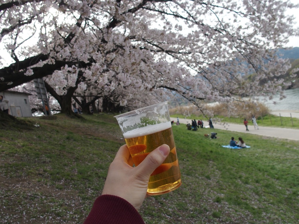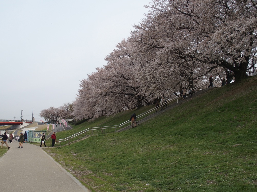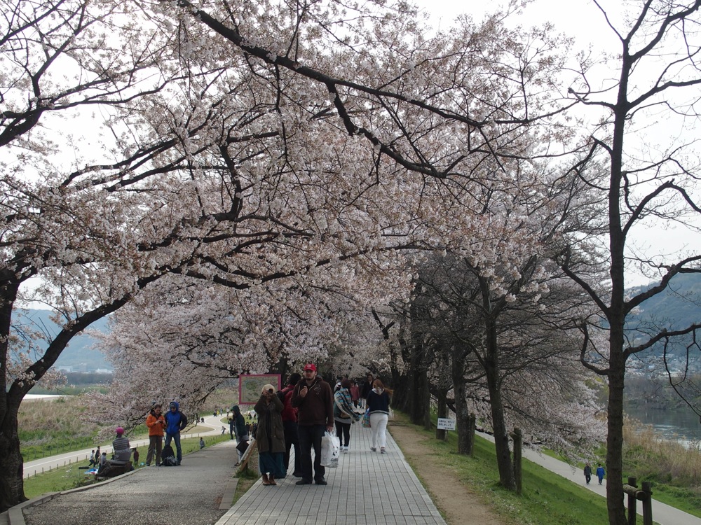 山の上からの景色でも分かるように、ここは木津川と宇治川、そして桂川が合流して淀川になるという地点で、その川に挟まれた細長い背割堤が例の場所というわけです。その植栽された桜並木の長さは1、4kmにも達し、しかも満開に近い状態でもありました。歩いて回るには丁度良い規模かもしれません。早速ビールを片手に、散策開始です♪