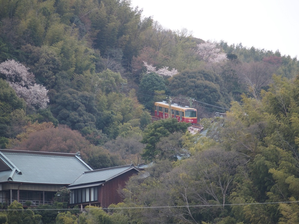 それは宇多野駅(左上写真参照)〜鳴滝駅間にあり、右上写真のような感じになります。これは素晴らしいですね。電車も、普段は1両編成のところを、この時期は2両に増結されて走っており、沢山の観光客に配慮していました。また、桜の区間は夜になるとライトアップがなされるのだそうで、今回は無理ですが、いつかは見てみたいものだと思いました。本当に今回は、桜に堪能された旅になりましたね。