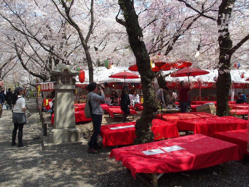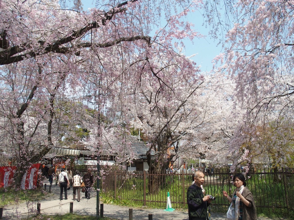 境内は満開の桜で溢れていました。そして、場所によっては色々な種類の桜がある事に気付かされます。それは、ある程度植物に詳しい人でないと分からない…というものではなく、明らかに見た目から異なる桜が存在し、そしてそれは開花の時期も若干異なるのだそうです。特に有名なのは魁(さきがけ)桜というもので、この神社が発祥の桜の品種なのだとか。その名の通り、開花時期が他のものに比べて早く、この桜が咲き始めると、都のお花見が始まると言われているのだとか。