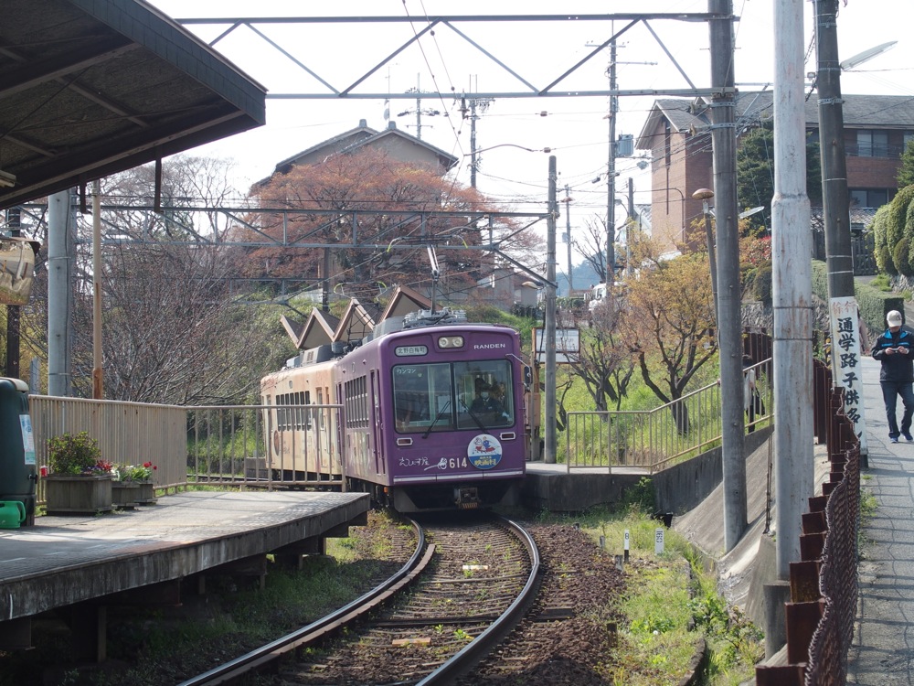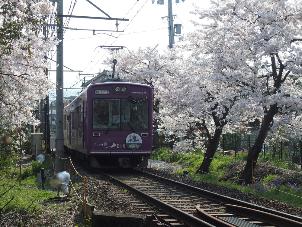 色々と、桜をテーマに神社仏閣を巡ってきましたが、やはり自分らしい旅の基本として、鉄道と桜という組み合わせも忘れてはいけません(笑)。そんな希望?を叶えてくれるのが、この近くを走っている京福電気鉄道(嵐山を通るので、嵐電と呼ばれています)です。特に北野線の方は付近に桜のトンネルと呼ばれる鉄道名所があり、仁和寺からも割りと近かったので、こちらも寄ってみる事にしました。