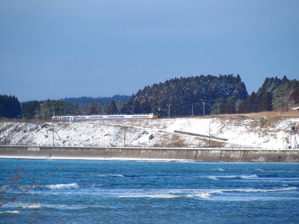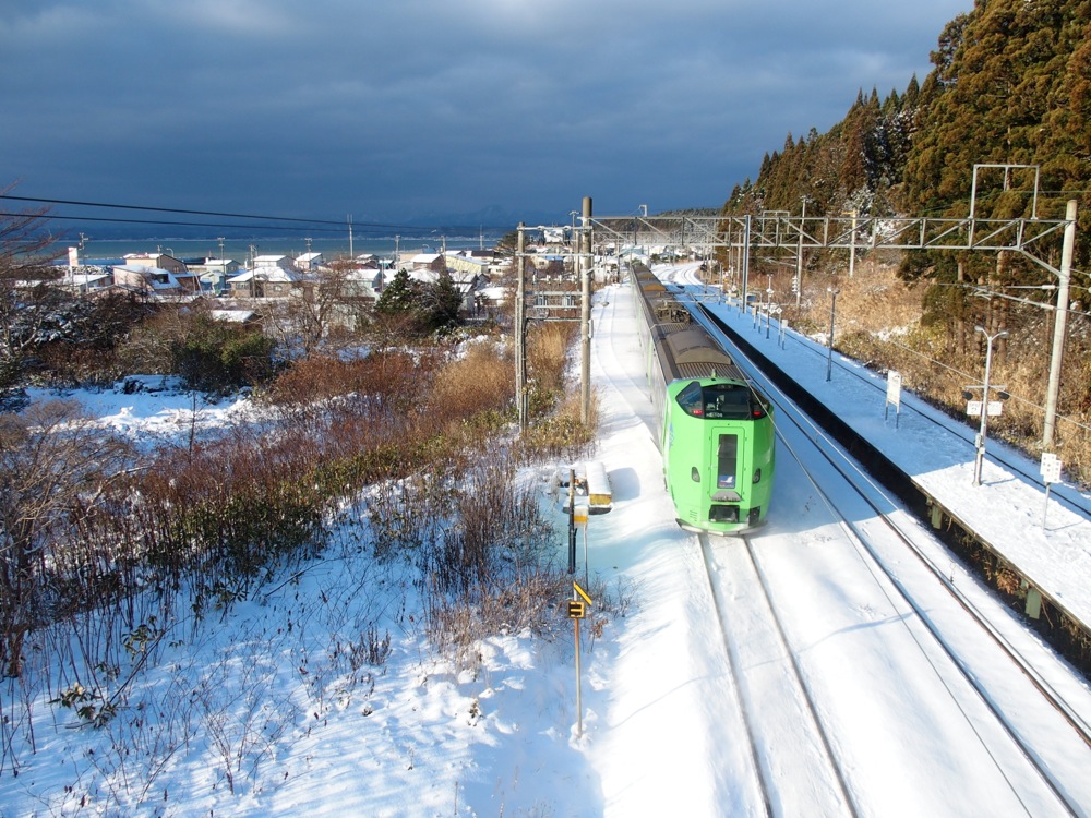 殆ど国道228号線と並行していますが、早速函館山も見えました(左上写真参照)。東京からずっと列車旅をしててこの区間に差し掛かると、北海道に入ったという実感が強く湧いた事を覚えています。ここを走る昼行特急列車は、殆どがJR北海道車両が担当する『スーパー白鳥』号となりますが、1日2往復のみ、JR東日本485系が担当する特急『白鳥』号も足を延ばします(右上写真参照)。これは本州で活躍する電車が北海道に定期的に乗り入れるという貴重な例でもありましょう。繰り返しになりますが、新幹線開通後のこういった例は、新幹線と貨物列車を除くと皆無となります。