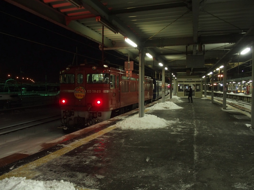 青森駅〜札幌駅間を青函トンネル経由で結ぶこの列車は、現在JRで唯一の定期急行列車でもあり、数少ない夜行列車の1つでもあります。機関車が客車を牽引するという、鉄道発祥の頃は当たり前だったスタイルも既に貴重なものとなっており、正に現代に生きる夜汽車に相応しい列車とも言えましょう。車両はかなり年季が入っており、寒さの厳しい北の大地で走り続けた貫禄をも感じさせてくれました。