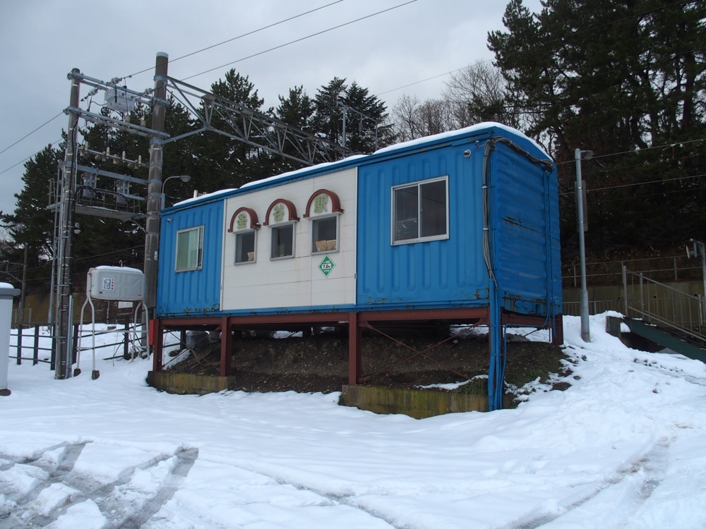 津軽飯詰駅は元々列車の行き違いが出来る駅でしたが、現在は1面1線の棒線状の駅となっています。ただ、駅構内の端に目をやると、線路の分岐器上にスノーシェッドが設置されているのが分かります(右上写真参照)。今は使われていない分岐器ですが、かつて風雪から制動を守る為に設置されたのが現在でも残っているのです。これは雪国ではよく見る設備ではありますが、面白いのは、ここでは西側(写真では右側)から吹き付ける季節風対策が強化されていて、そちら側は厳重になっているのに対し、東側は鉄骨のみになっているという事でしょう。効率化を図る地方私鉄ならではの事かもしれません。
