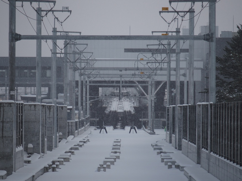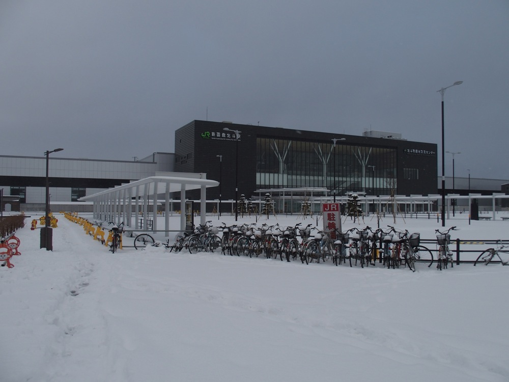 そんなわけで、広い空間のあるこの場所が選ばれたわけですが、昔の渡島大野駅の雰囲気からすると大変貌も良いところで、急激な出世を遂げたとでも言いましょうか。とにかく、激しい変化がこの場所には起きていたのでした。もう、駅は外観を含め、大まかな部分は完成しており、いつ新幹線車両が来てもおかしくない状態になってはいました。雪が積もっていたので、駅前の整備された様子は若干分かりにくかったのですが、恐らく綺麗に、そして整然とされた風景が広がっているのだと思います。駅から離れ、札幌方向に進んでみると、新幹線の高架橋はこの先でひとまず断たれていました。右下写真は、隣りを走る函館本線の線路をオーバークロスする車道からのもので、更に新幹線が延伸された時に、この道路の処遇はどうなるのかも少し気になるところでした…。