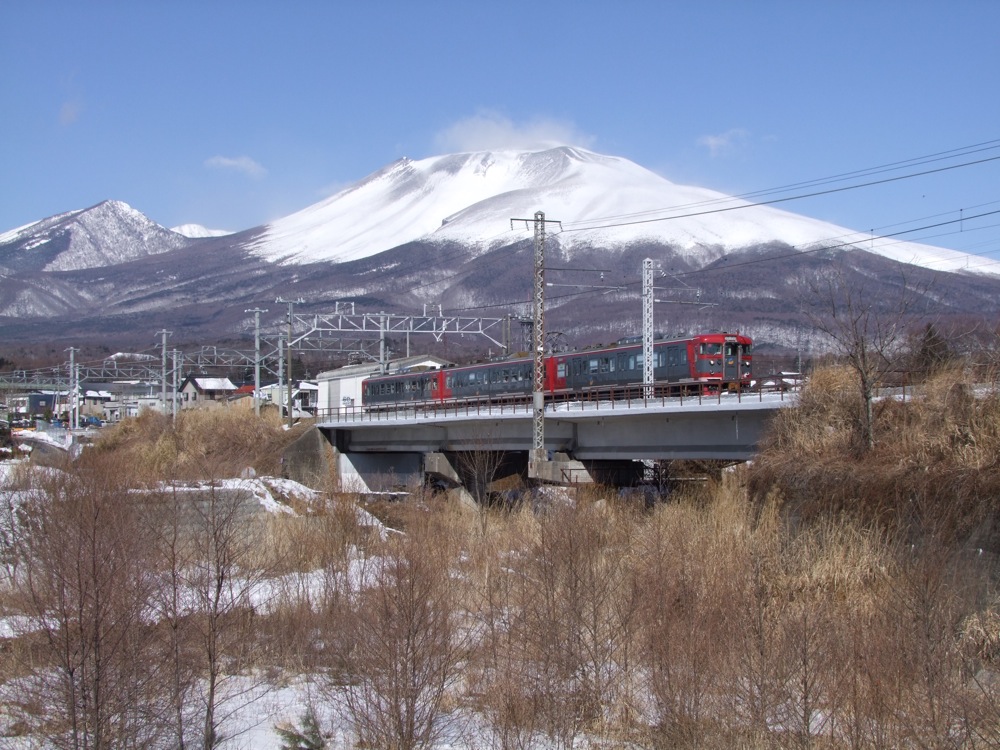 ちなみに、この169系を使って、リバイバル列車として急行『志賀』号等、イベント列車も数多く運転されているのですが、自分としては普段の姿を見ておきたかったのでした…。全容がハッキリ見える浅間山をバックに走る、湘南色の169系…。この姿が見れるだけで、寒い想いをしてまで(笑)、ここまで来た甲斐があったというものです。