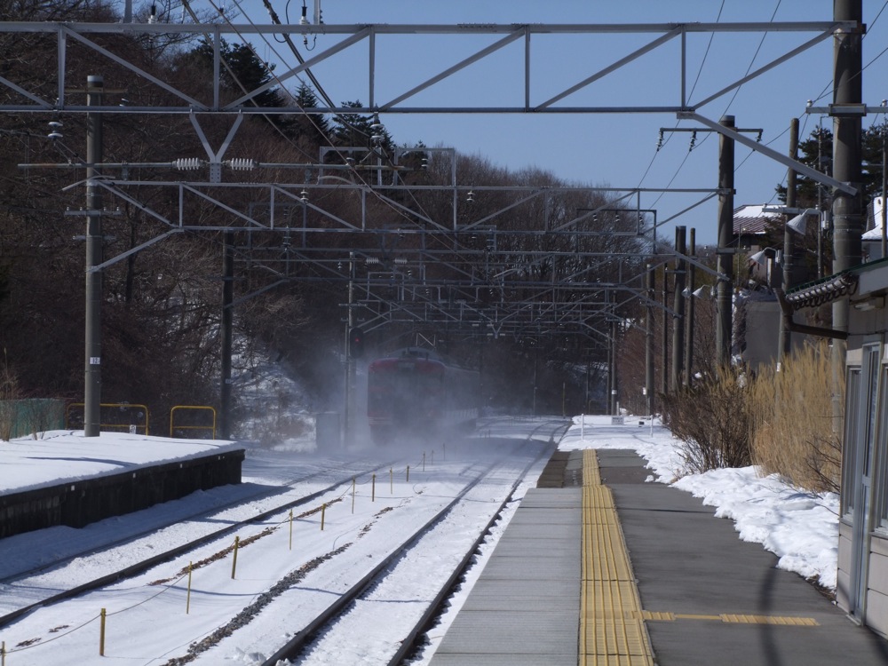 それにしても…寒いです。ここは浅間山の裾野のような場所にあたり、長野方面に向かって、ちょっとした傾斜になっているのですが、そこから吹き上げてくる風がわりと強めで、どんどん体温を奪っていくのです。雪もまだまだ残っていて、常に風が吹いている証拠として、地面に積もっている雪が風の経路をそのまま残しており、霧氷のようにも見えます。そんな中でも、時刻通りに、ただ坦々と運行している鉄道…。これがまた良いのです。