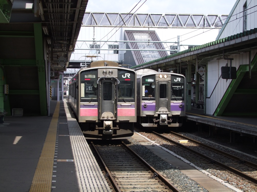 下の写真を御覧下さい。どちらも秋田からやってきた列車ですが、それぞれ使っている線路が異なっているのが分かります(軌道の幅は勿論違います)。日本の列車は左側通行ですが、左の写真の在来線車両は、右側通行として走行していますね。つまり、こちらから見て、左の線路が奥羽本線の在来線用で、右の線路が秋田新幹線用…という事です。日本では結構珍しいケースですが、一部には、秋田新幹線同士が行き違えるように、在来線軌道を三線軌条にしている区間もあり、更に複雑になっています。鉄道ファン的には興味深い事例ですね。