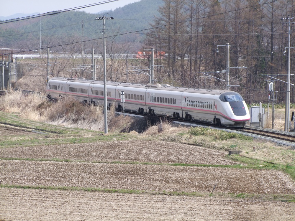さて、今度はE3系の『こまち』号で先に進みます。ここから先は大曲駅まで、徐々に標高を下げていく感じで進み、基本的に下り坂が続きます。E6系ですと7両編成ですが、E3系ですと6両編成となっており、これはE6系の場合、先頭車の流線型の部分が長過ぎて、E3系と同じ6両編成にすると定員が少なくなってしまうからです。そして、E3系も登場当時は5両編成でしたが、これが6両編成になったのは、単純に利用客が増えた為でもありました。
